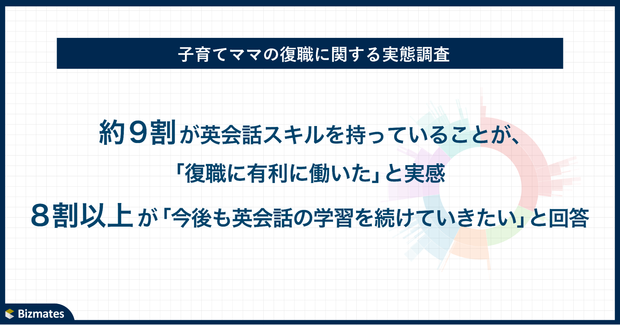 今回は、子育てを理由に仕事を離れた後の復職時の就職活動で、自身の英会話スキルを活用できる仕事を探し、実際に英会話スキルを活用する仕事に復職した経験がある女性423名を対象に、子育てママの復職に関する実態調査を実施しました。