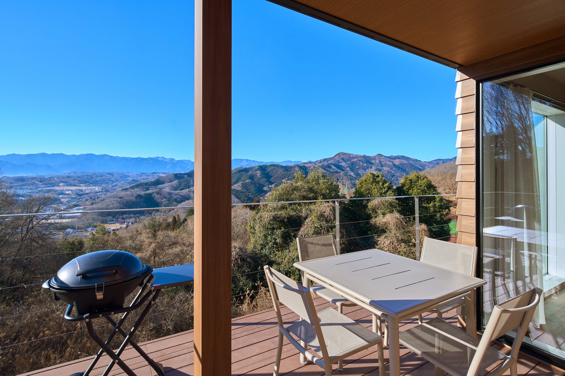 1室53.42㎡のコテージは最大5名まで利用可能なTerrace Cottage 4棟と、最大3頭の愛犬が一緒に泊まれるDog Friendly Cottage 2棟の全6棟。全てのコテージに秩父の山々とまちなみを一望できるウッドデッキを設けており、朝焼けから夕焼け、夜景まで 自然が見せるさまざまな表情を楽しめます。