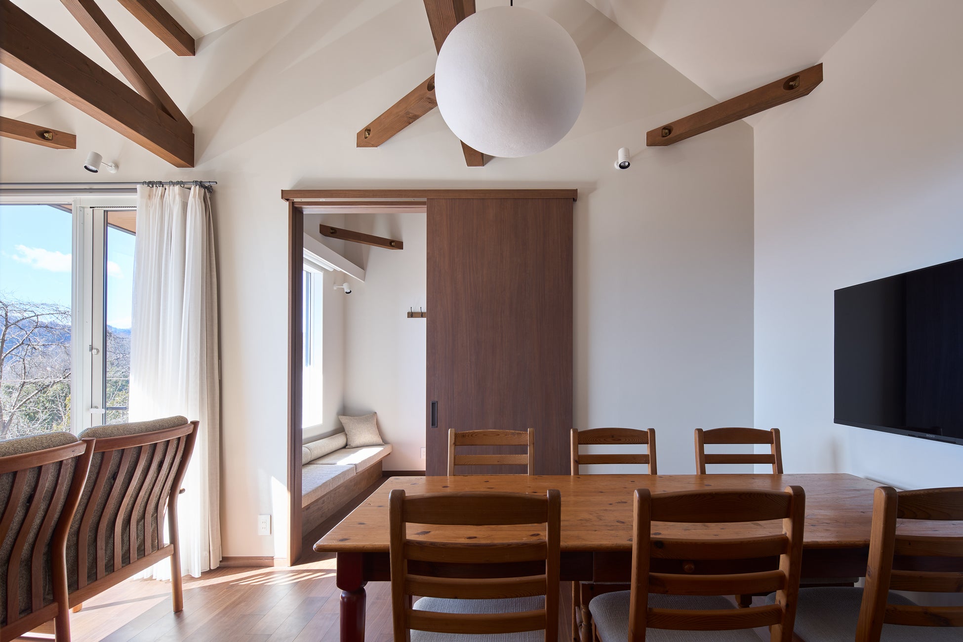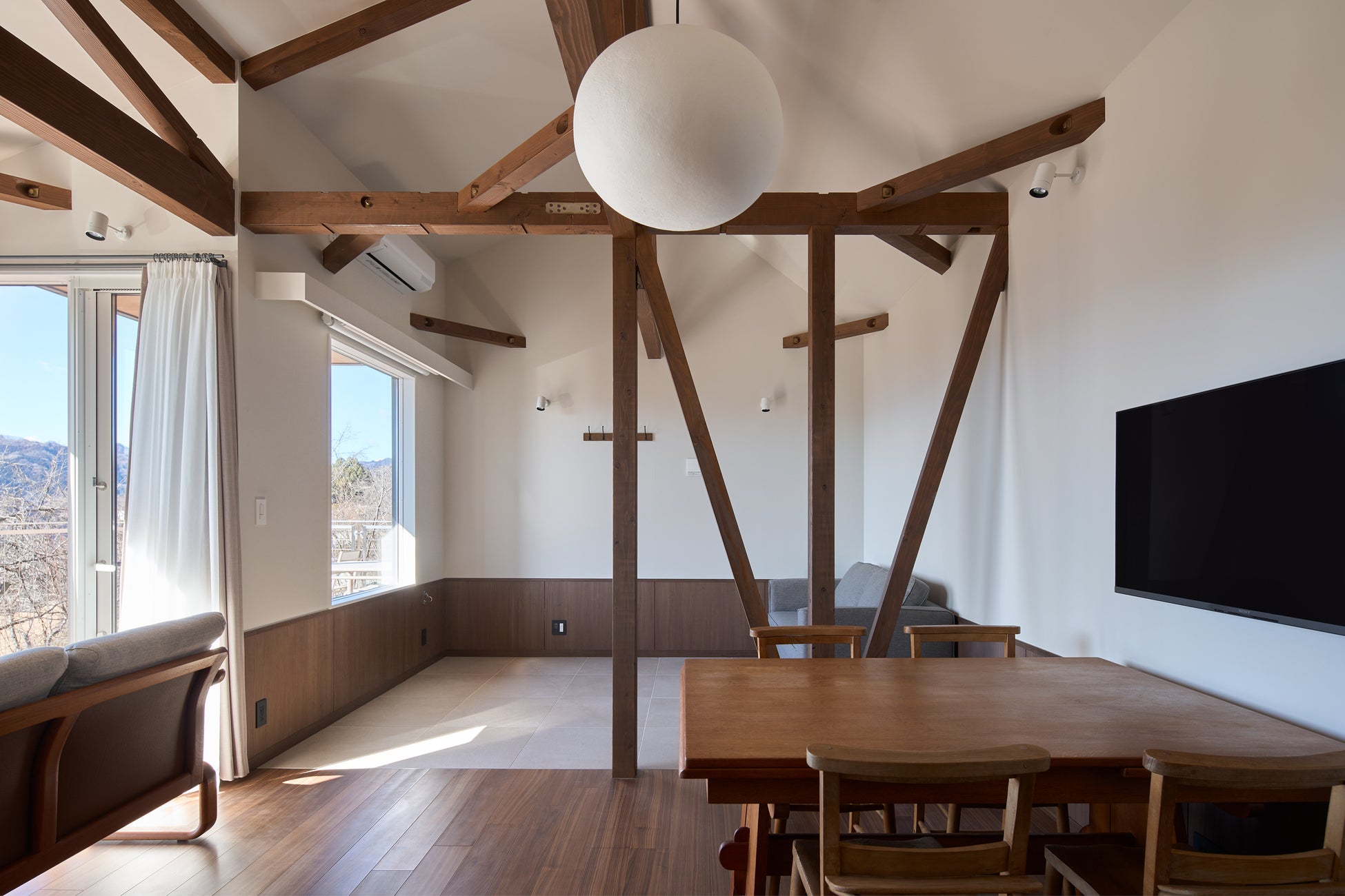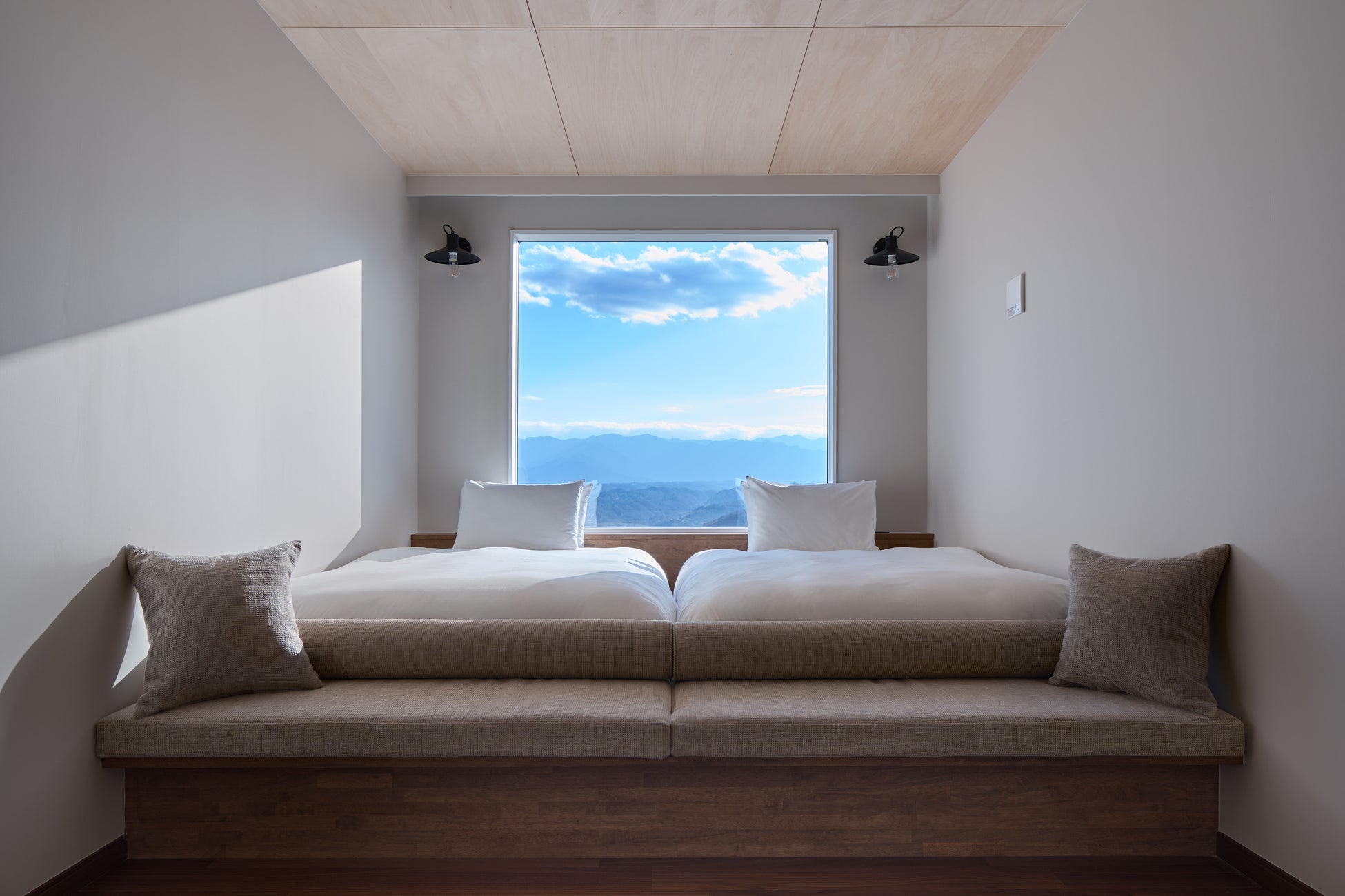 室内は、外に広がる景色を引き立てるようシンプルなデザインとし、天井の梁や床に使用した木や、手しごとと時間が生み出す風合いのが心地よいヴィンテージ家具で温もりを添えています。リビングルームとベッドルームには大きな窓を設け、適した気象条件が揃った時には、秩父の魅力の一つである雲海を望むことができます。