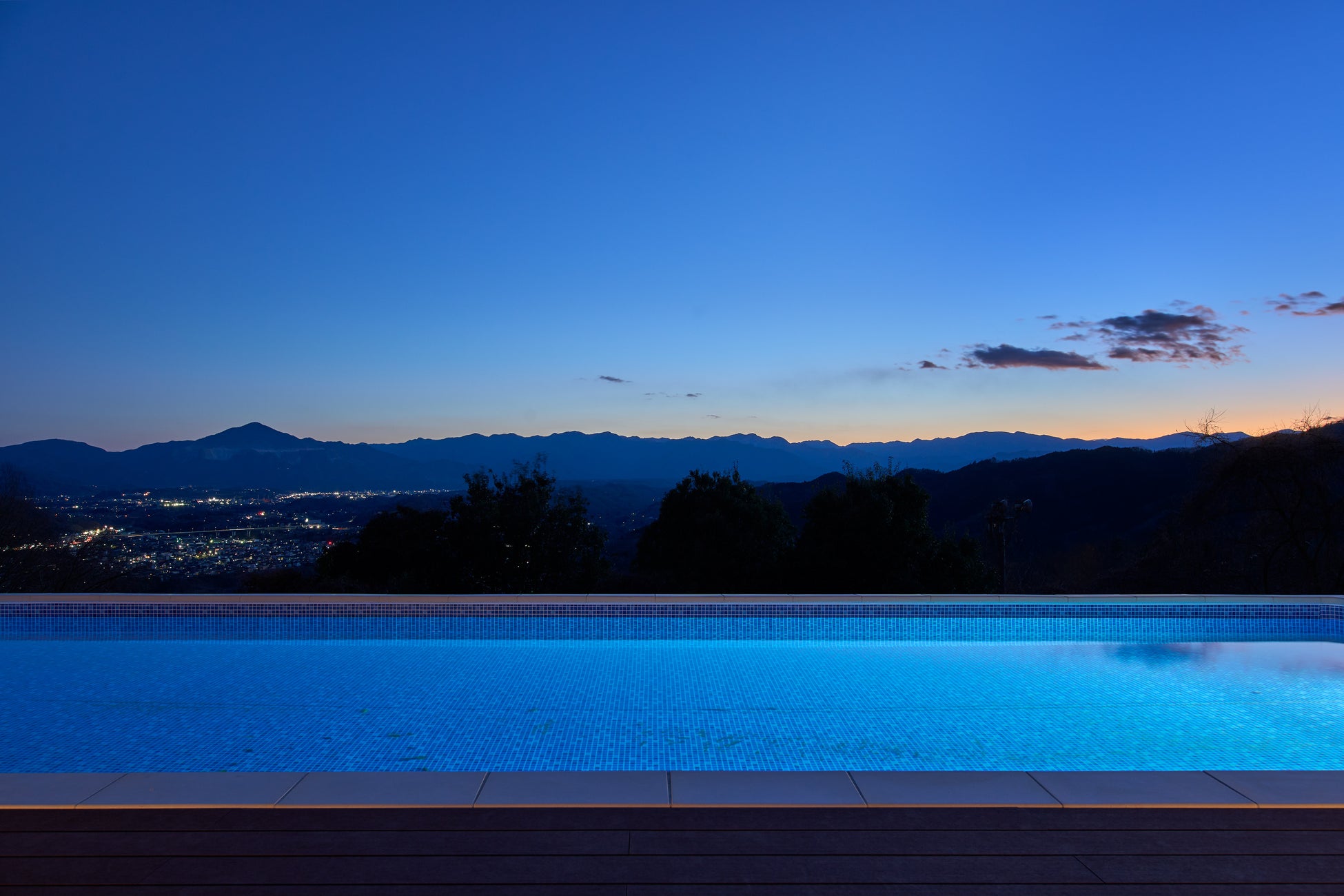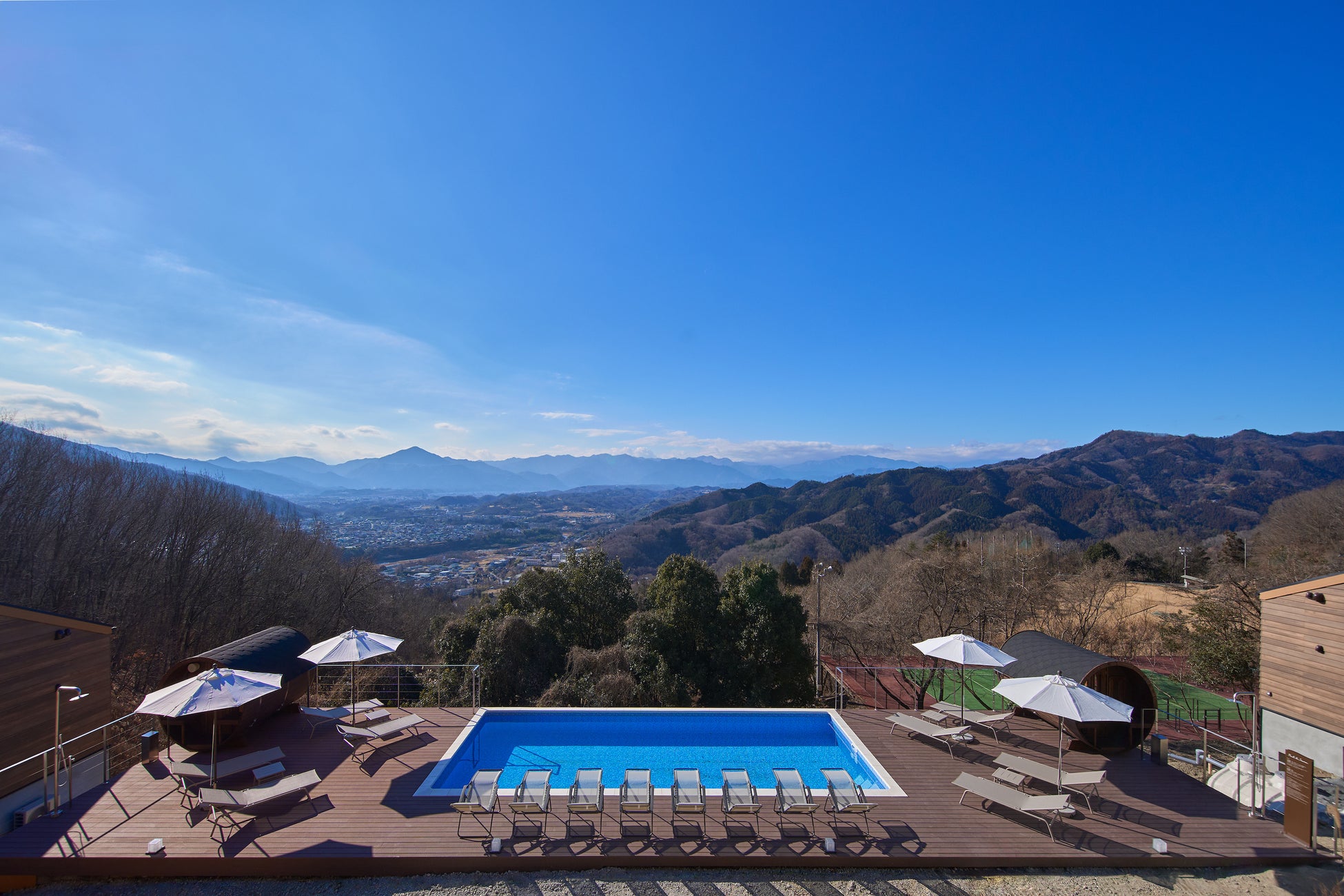 空と山々に抱かれたプール&サウナ