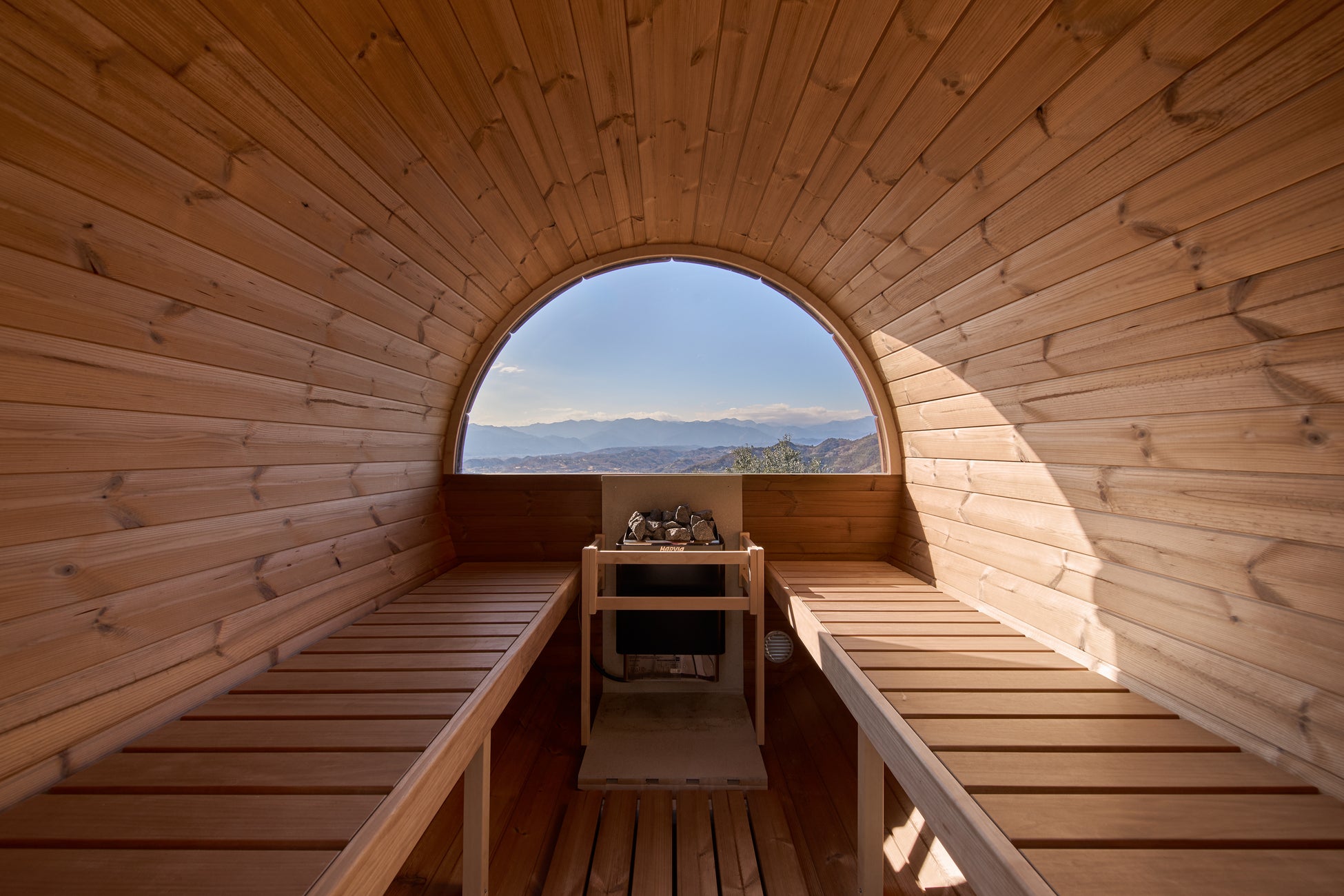 プールサイドにはバレルサウナを2つ設置しています。セルフロウリュができ、大きな丸窓の先には四季のパノラマビューが広がります。
