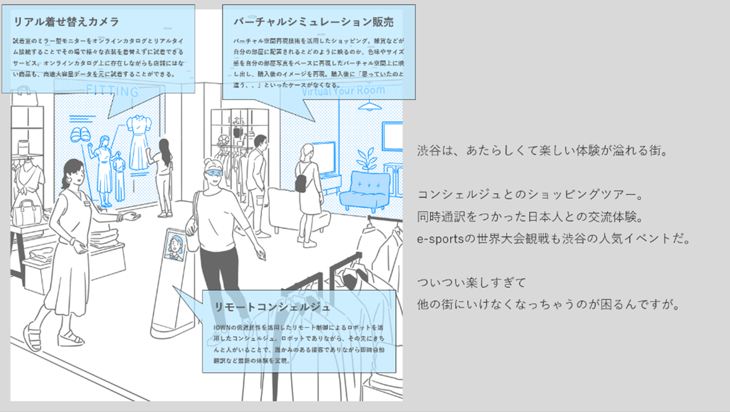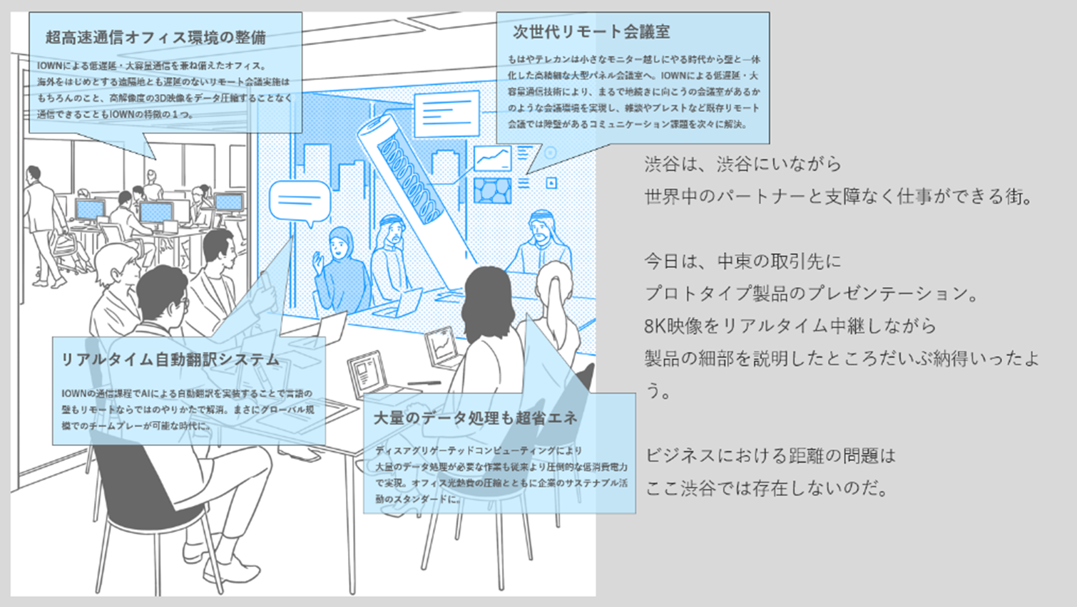 オフィスフロア及びイベントスペースに対して、APN IOWN1.0を活用した、高速かつ低遅延な通信環境を提供するとともに、今後、広域渋谷圏に対して、ネットワークに限らず、更なるIOWNサービスについても、先行的に世界初の導入を検討しています。