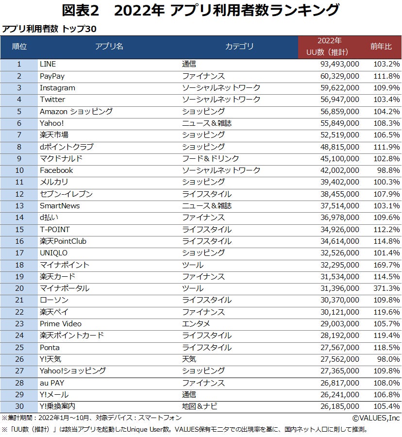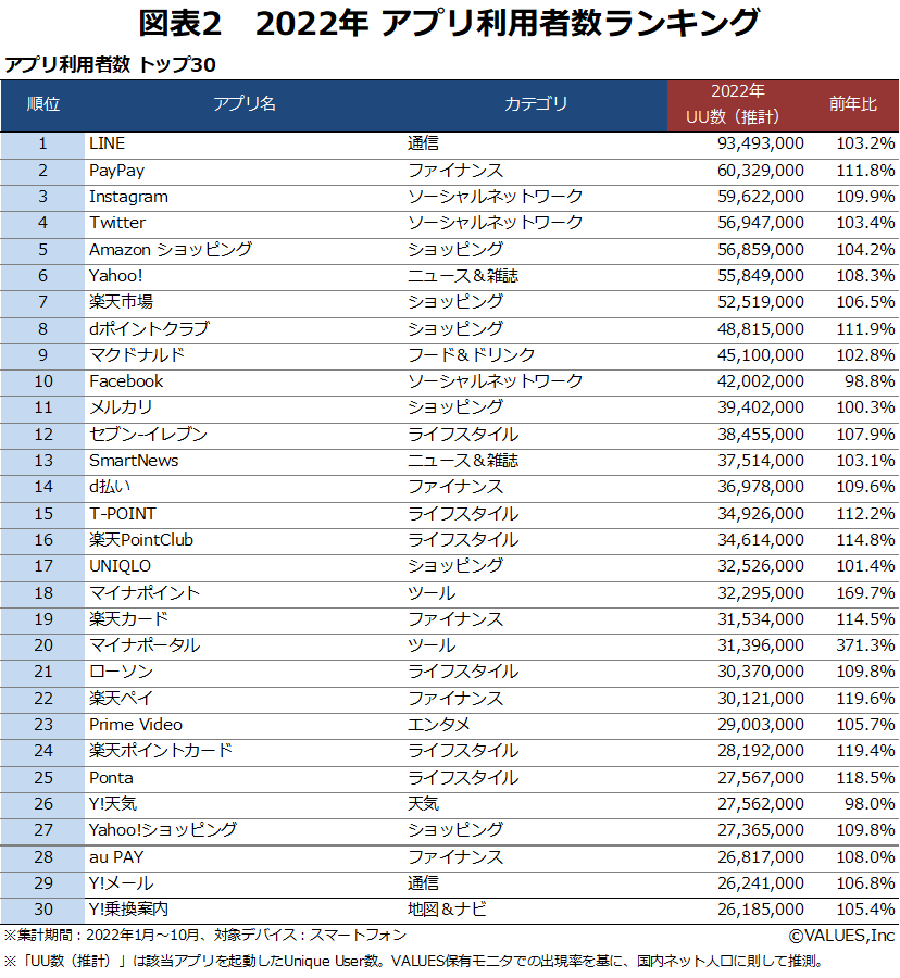 スマートフォンのアプリに関しても、2022年1月~10月のアプリ起動ユーザー数を調査することで、“実際によく使われているアプリ”をランキングにしました(図表2)。
