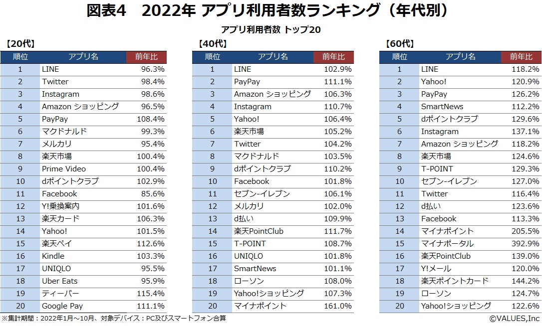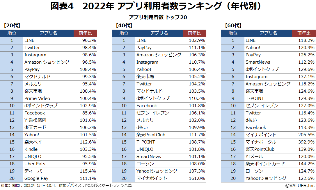 アプリの利用者数についても、年代別で集計を行い、20代、40代、60代以上のランキングを作成しました(図表4)。
