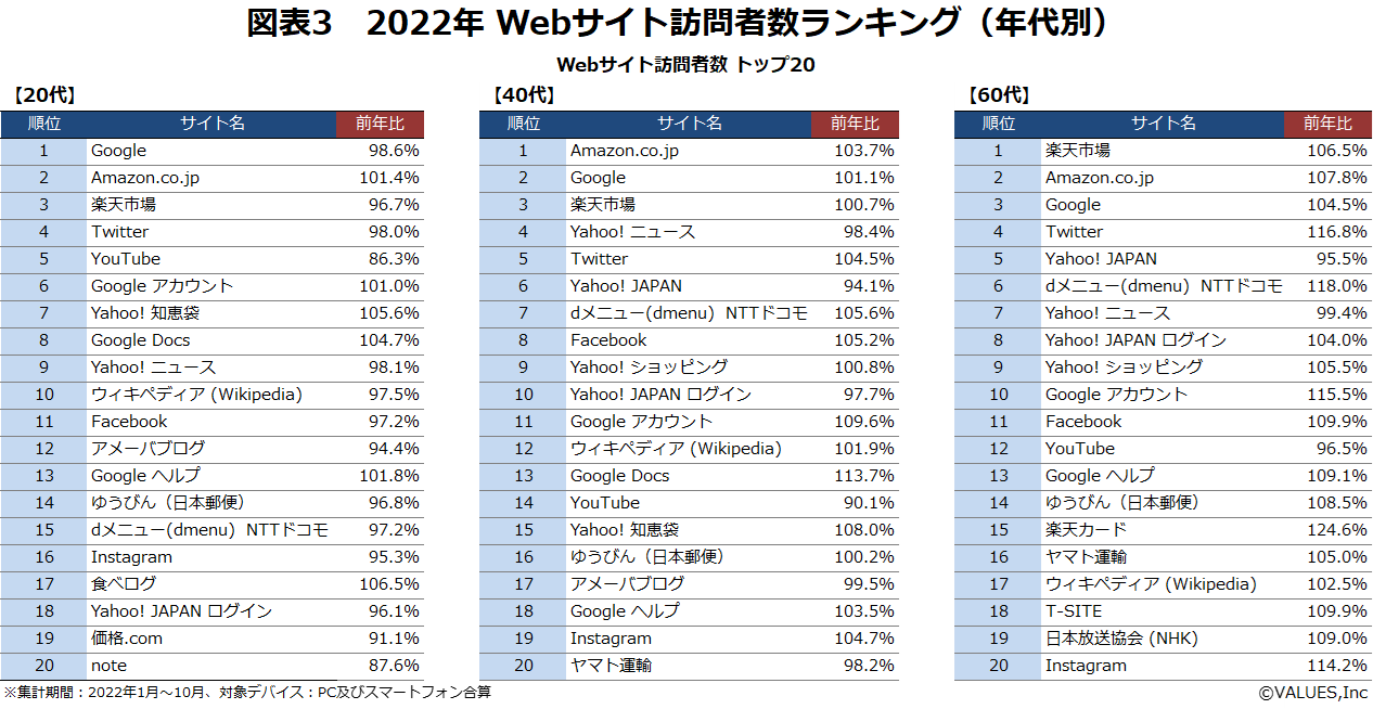Webサイトの訪問者数について、年代別でも集計を行いました。図表3は、20代、40代、60代以上のランキングです。