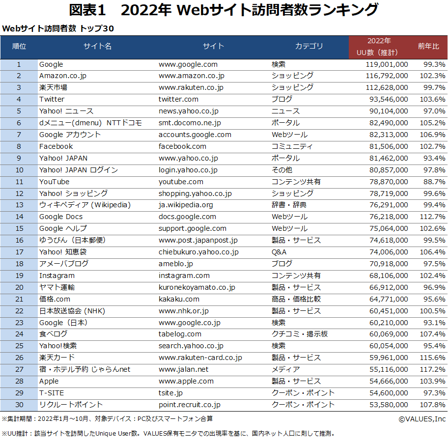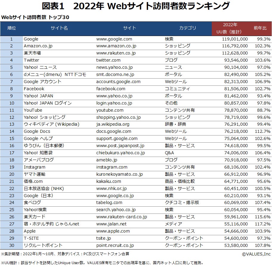 2022年、最も多くのユーザーがアクセスしたWebサイトはどこなのか、ヴァリューズが保有するWeb行動ログデータから各Webサイトの訪問者数を調査し、ランキングを作成しました(図表1)。