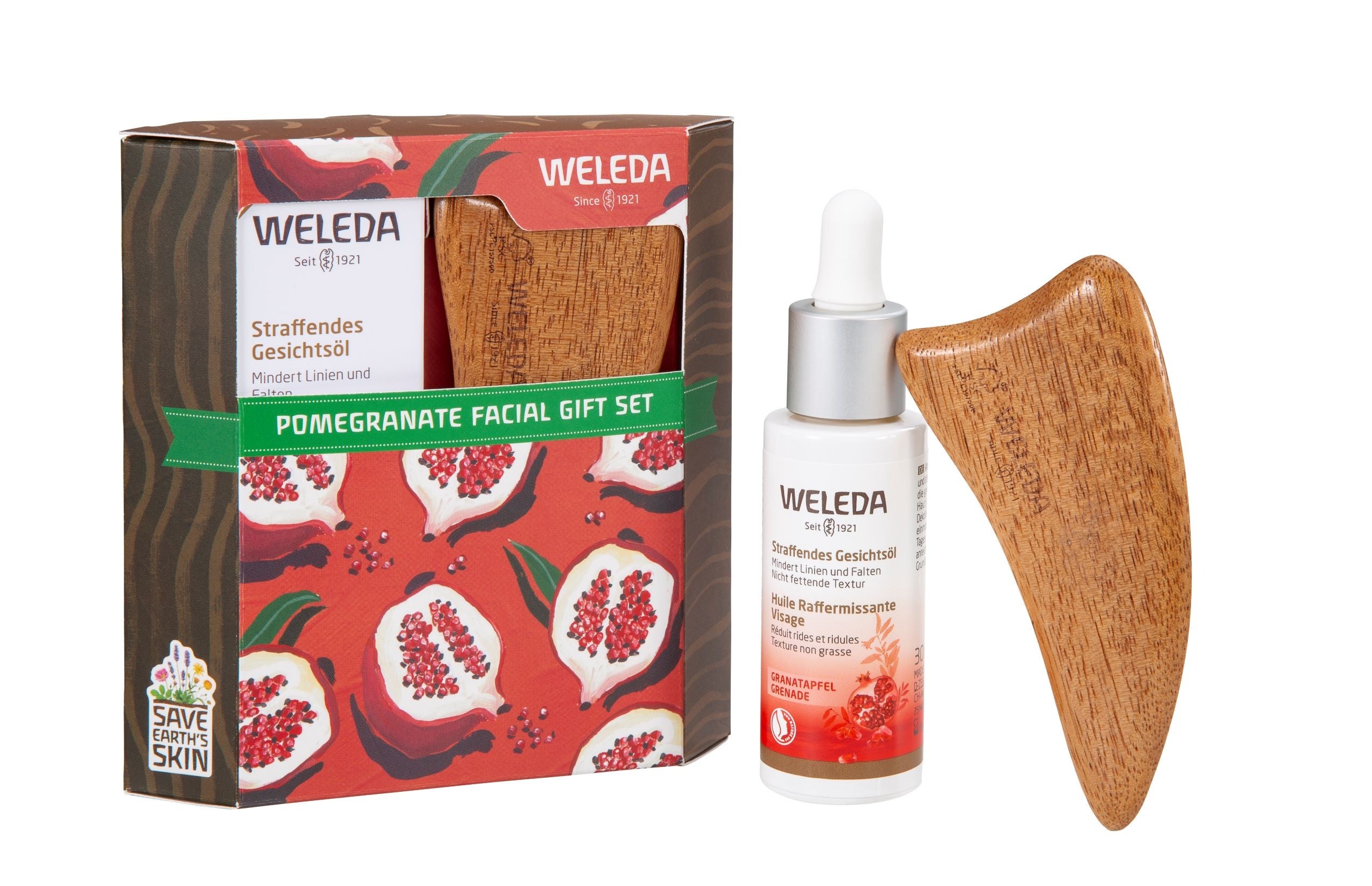 オーガニック植物オイルを豊富にブレンドした、プレミアムアンチエイジングケア*処方のざくろ フェイシャルオイルと、木製かっさのセット。
