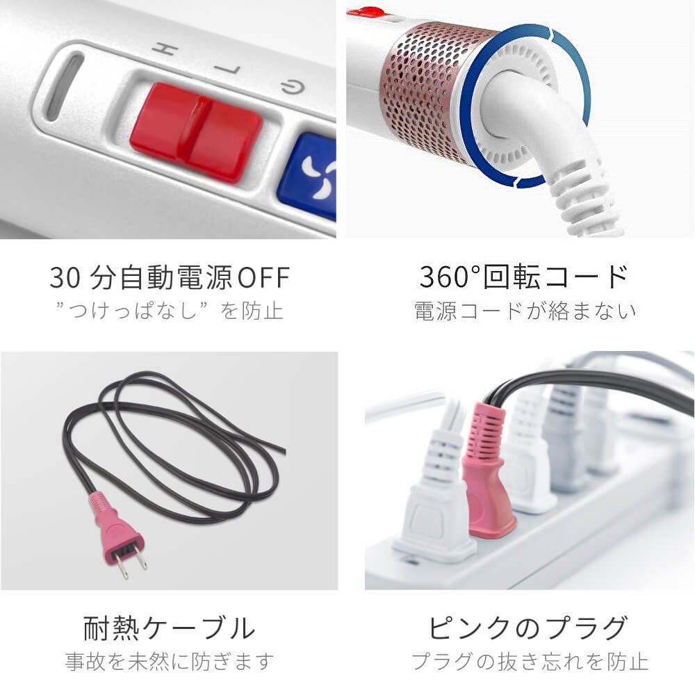 過熱検知、過電流防止機能を持つPTCヒーターが自ら温度をコントロールするから過熱による髪のやけども回避します。