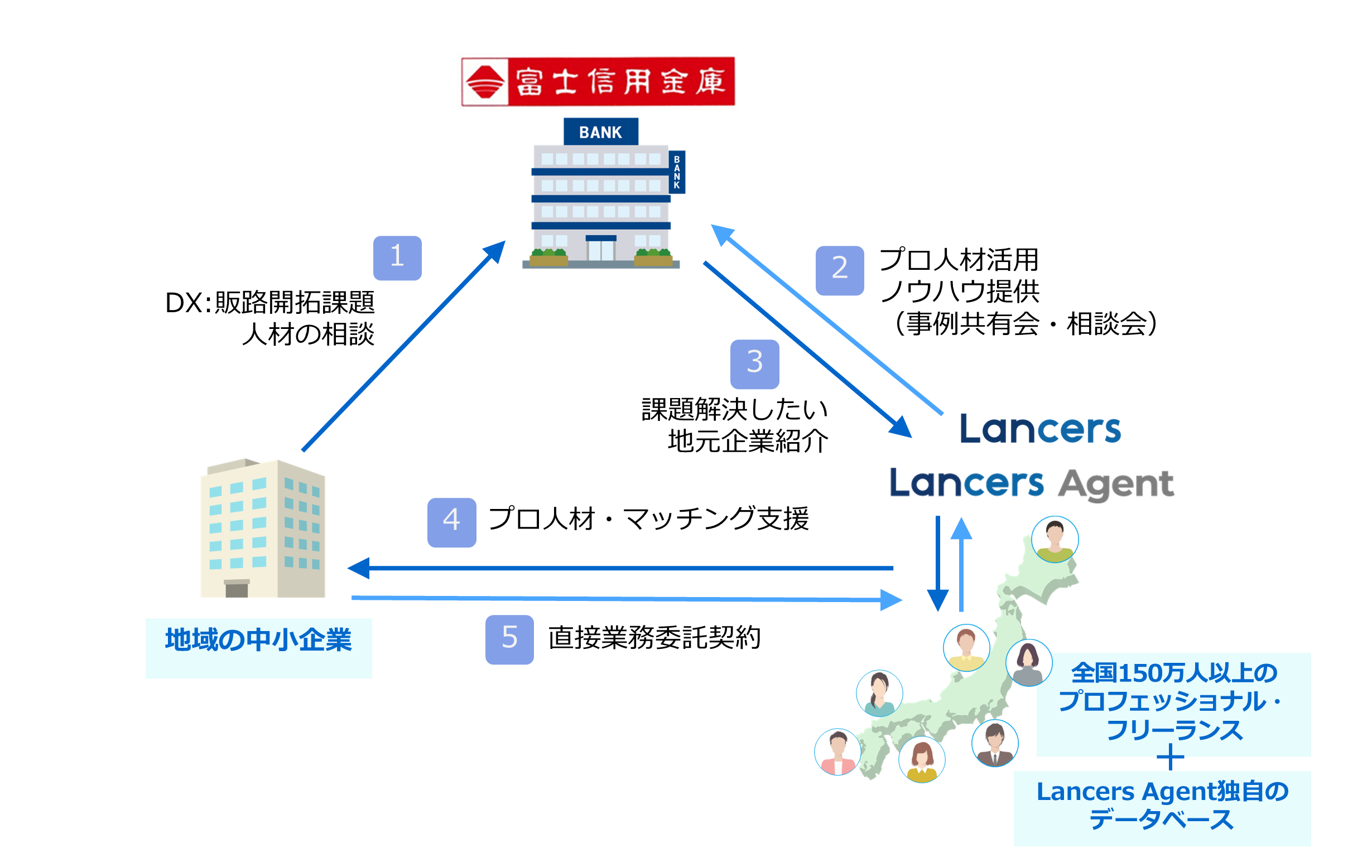 『ふじしん』が支援する地域の中小企業や個人事業主に対し、デジタル人材を中心とした150万人以上が登録する『Lancers』のデータベースを活かし、幅広い経験・知識を持ったプロフェッショナル人材とのマッチングを積極的に行ってまいります。本業務提携により、単発~常駐・リモート常駐までの様々な人材とのマッチングを支援いたします。