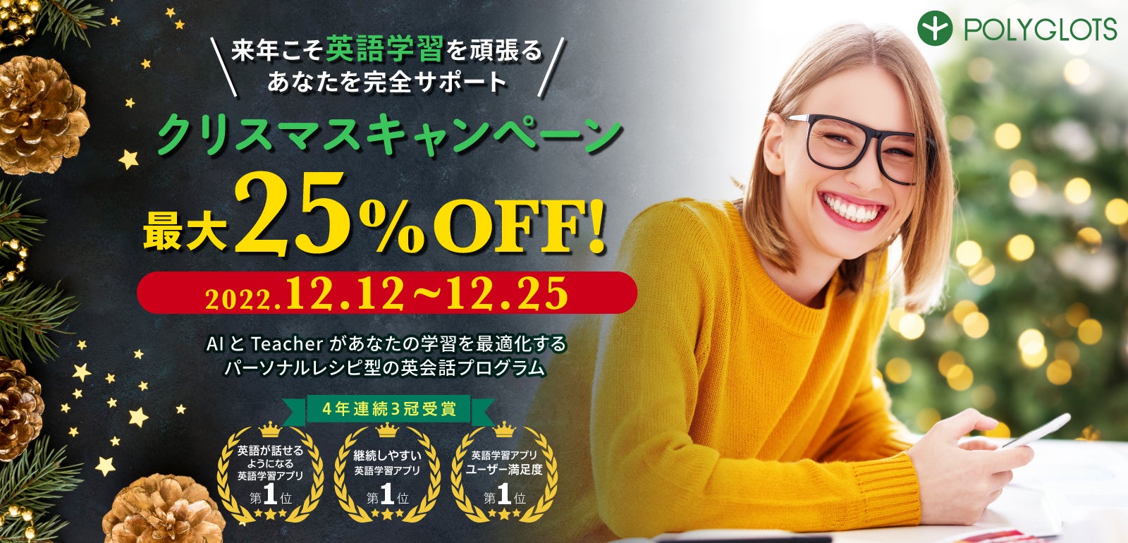 株式会社ポリグロッツ(本社:東京都新宿区、代表取締役:山口隼也)は、12月12日(月)~12月25日(日)までクリスマスキャンペーンを開催いたします。開催期間中は、パーソナルレシピ型英会話プランを最大25%OFFでご提供します。このお得な機会に、英語学習を強化してください。