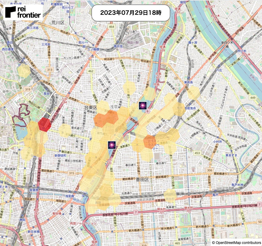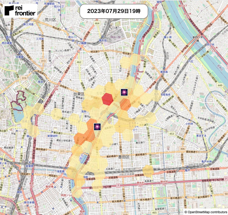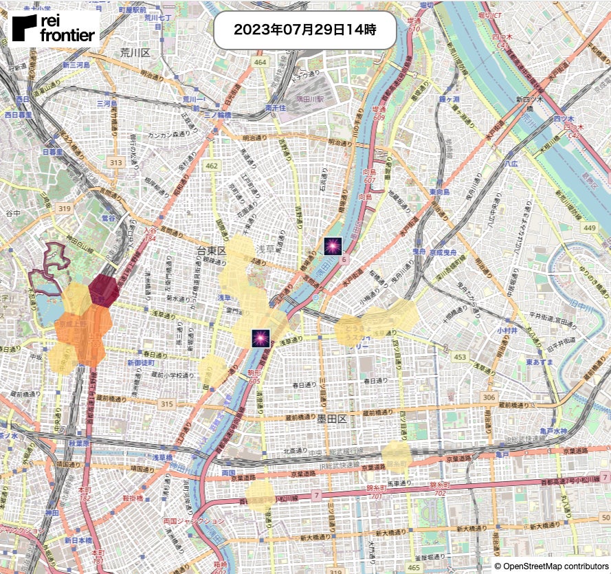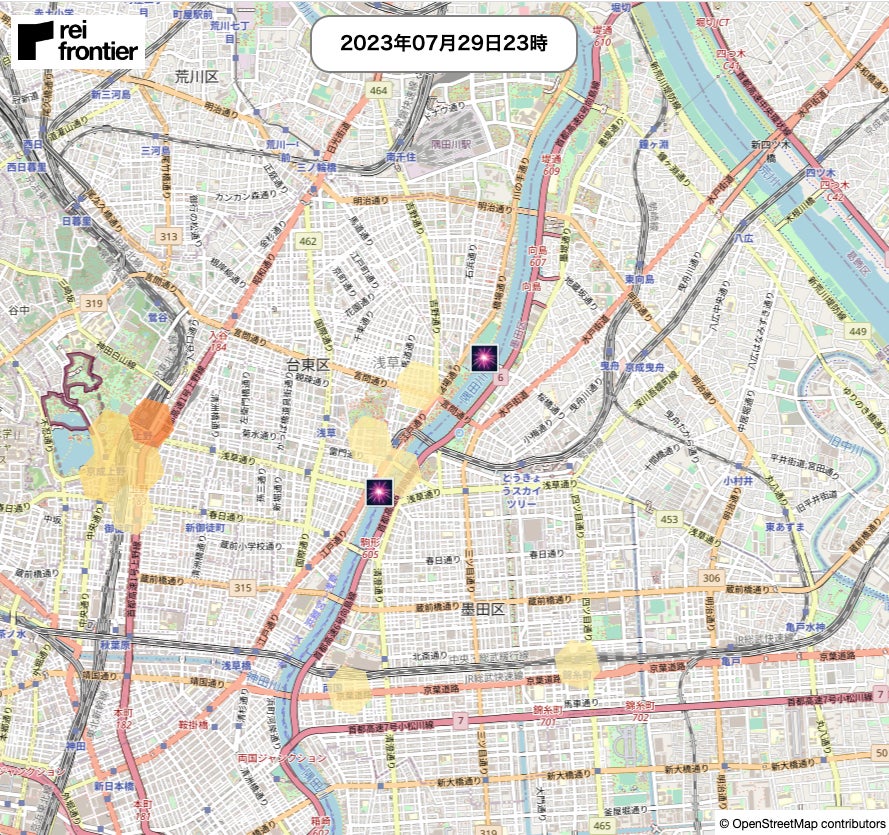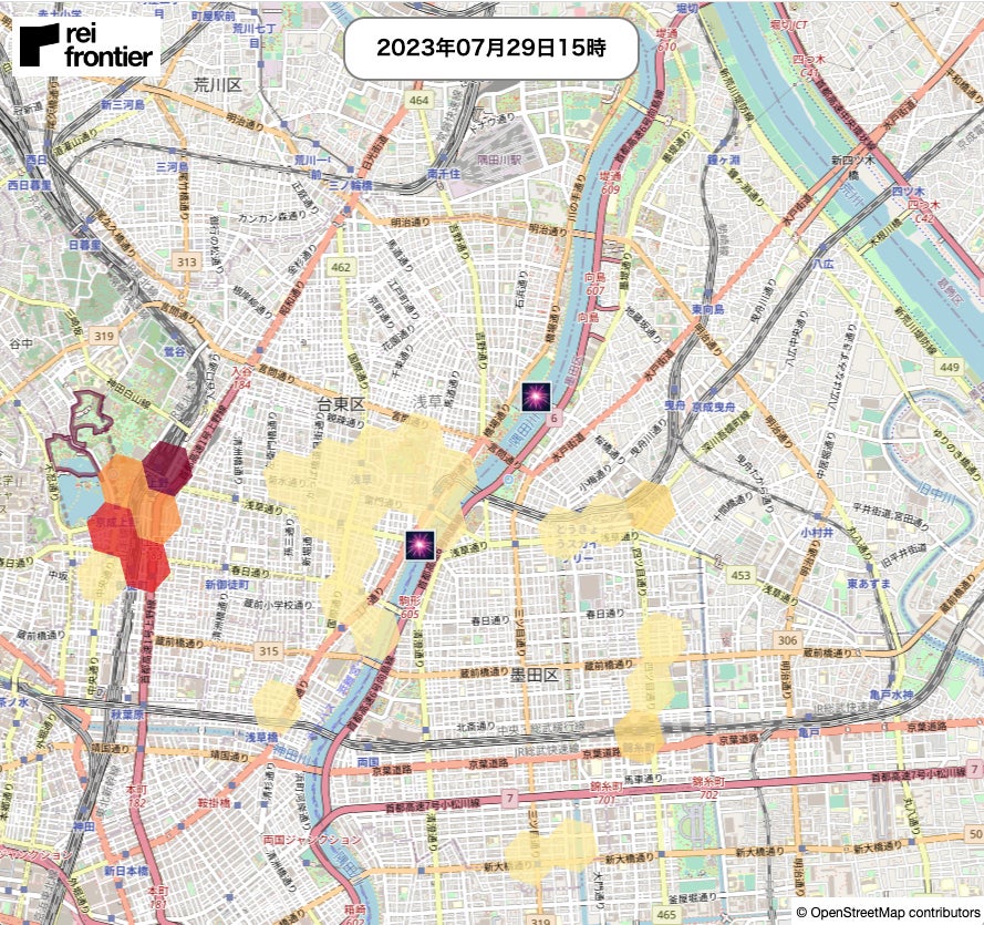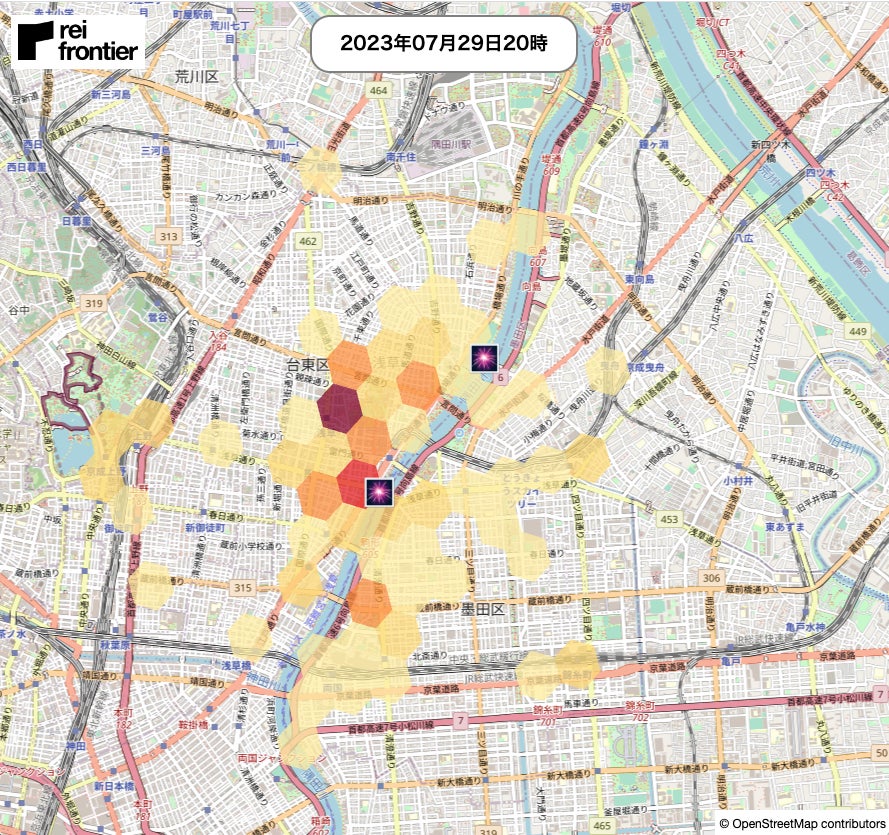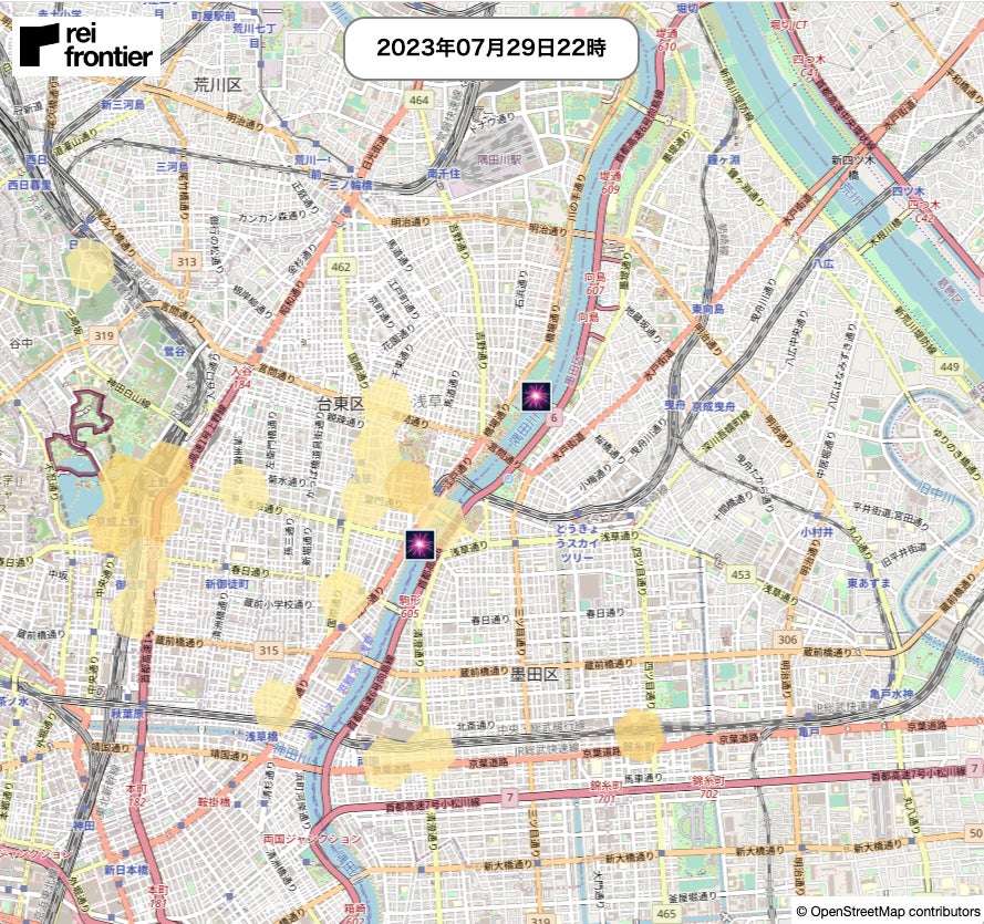 レイ・フロンティア株式会社(本社:東京都台東区、代表取締役:田村建士 以下、レイ・フロンティア)は、2023年7月29日に開催された「隅田川花火大会」での人流を分析しました。
