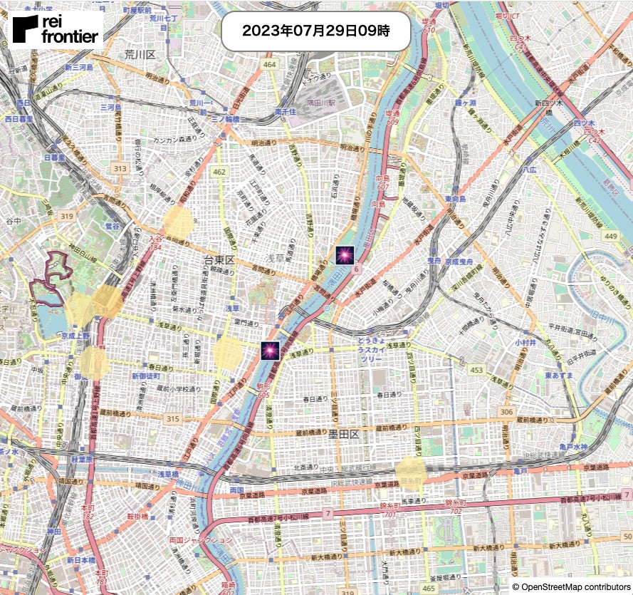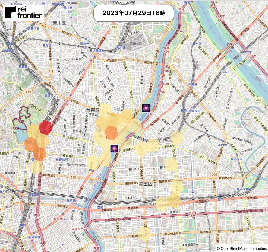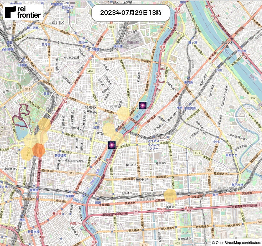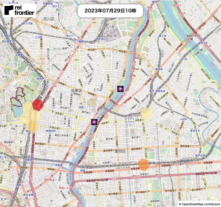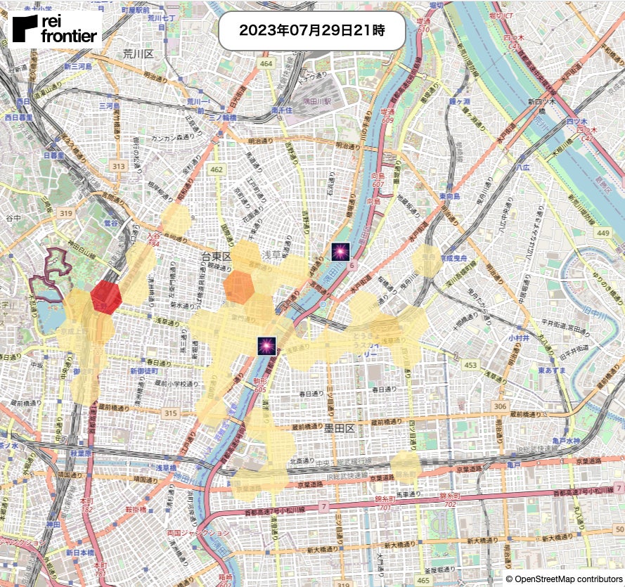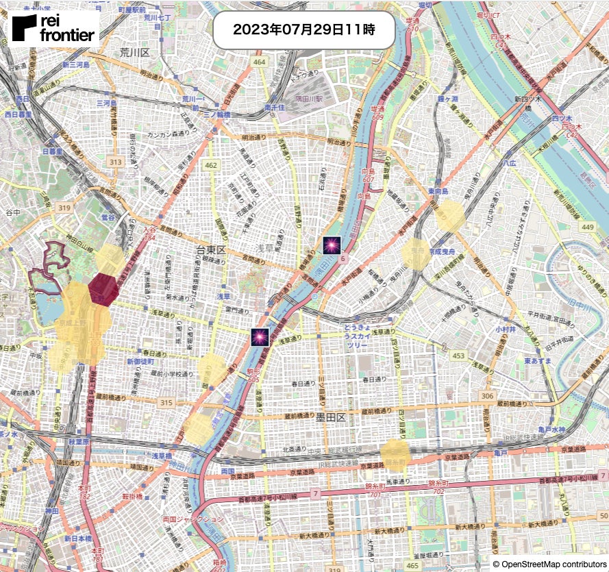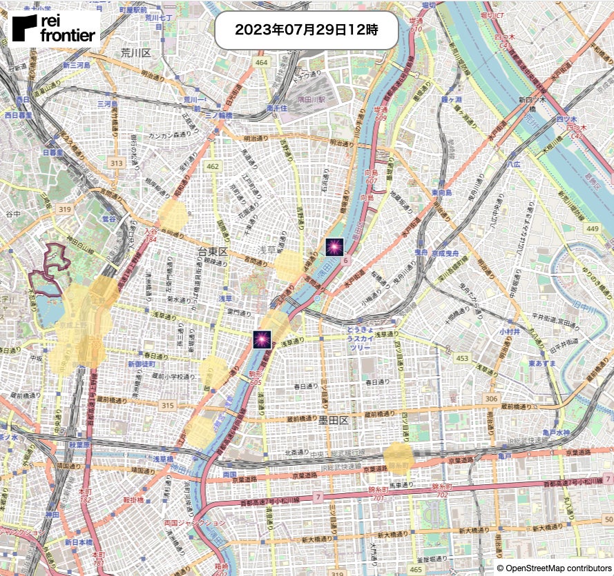 レイ・フロンティア株式会社(本社:東京都台東区、代表取締役:田村建士 以下、レイ・フロンティア)は、2023年7月29日に開催された「隅田川花火大会」での人流を分析しました。