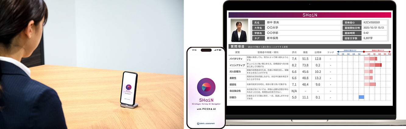 SHaiNの最大の特徴は、約4万件の面接データをもとに東京大学との共同研究によって開発された独自の評価AIアルゴリズムを搭載することで、評価根拠を説明可能にしたことです。