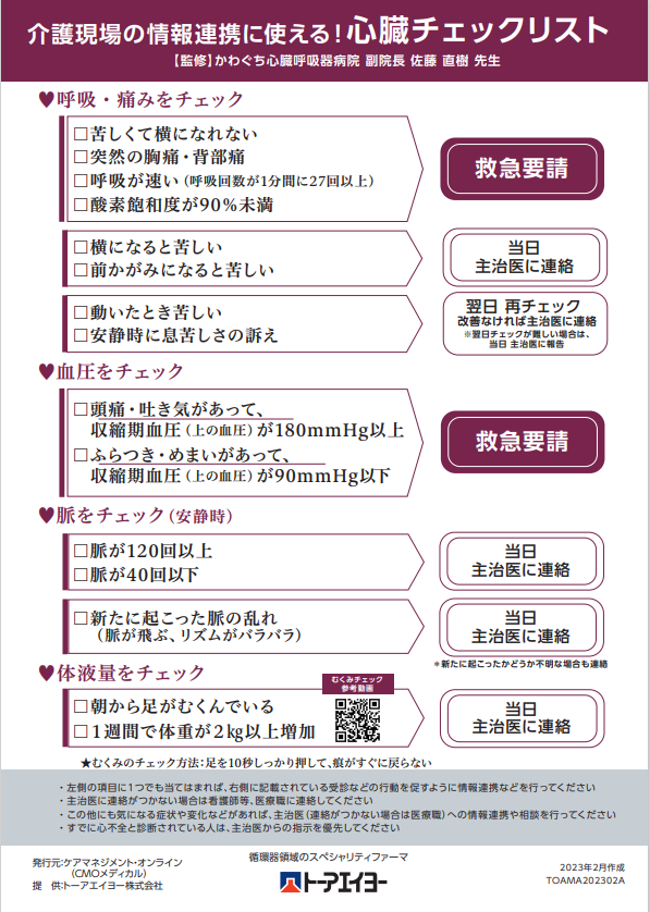 循環器医療において必要とされるスペシャリティファーマを目指し、循環器疾患治療剤を製造販売するトーアエイヨー株式会社(本社所在地:東京都中央区、代表取締役社長:髙橋 敦男、以下「トーアエイヨー」)と株式会社インターネットインフィニティー(本社所在地:東京都品川区、代表取締役社長:別宮 圭一、以下「インターネットインフィニティー」)は、介護支援専門員(ケアマネジャー、以下「ケアマネ」)ら介護従事者を対象として、介護現場で心不全の可能性に早く気づくための『介護現場の情報連携に使える!心臓チェックリスト( https://www.toaeiyo.co.jp/healthcare/heart-check.html )』を作成しました。
