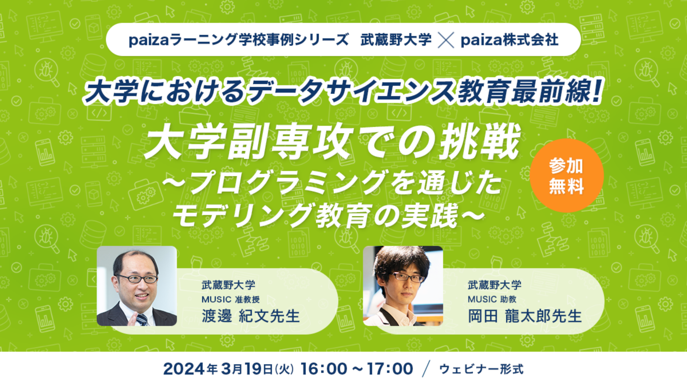 【大学・専門学校の教員向け無料ウェビナー】paizaラーニング学校事例シリーズVol.4「データサイエンス副専攻における文理混合のプログラミング教育事例(武蔵野大学様)」3月19日(火)開催