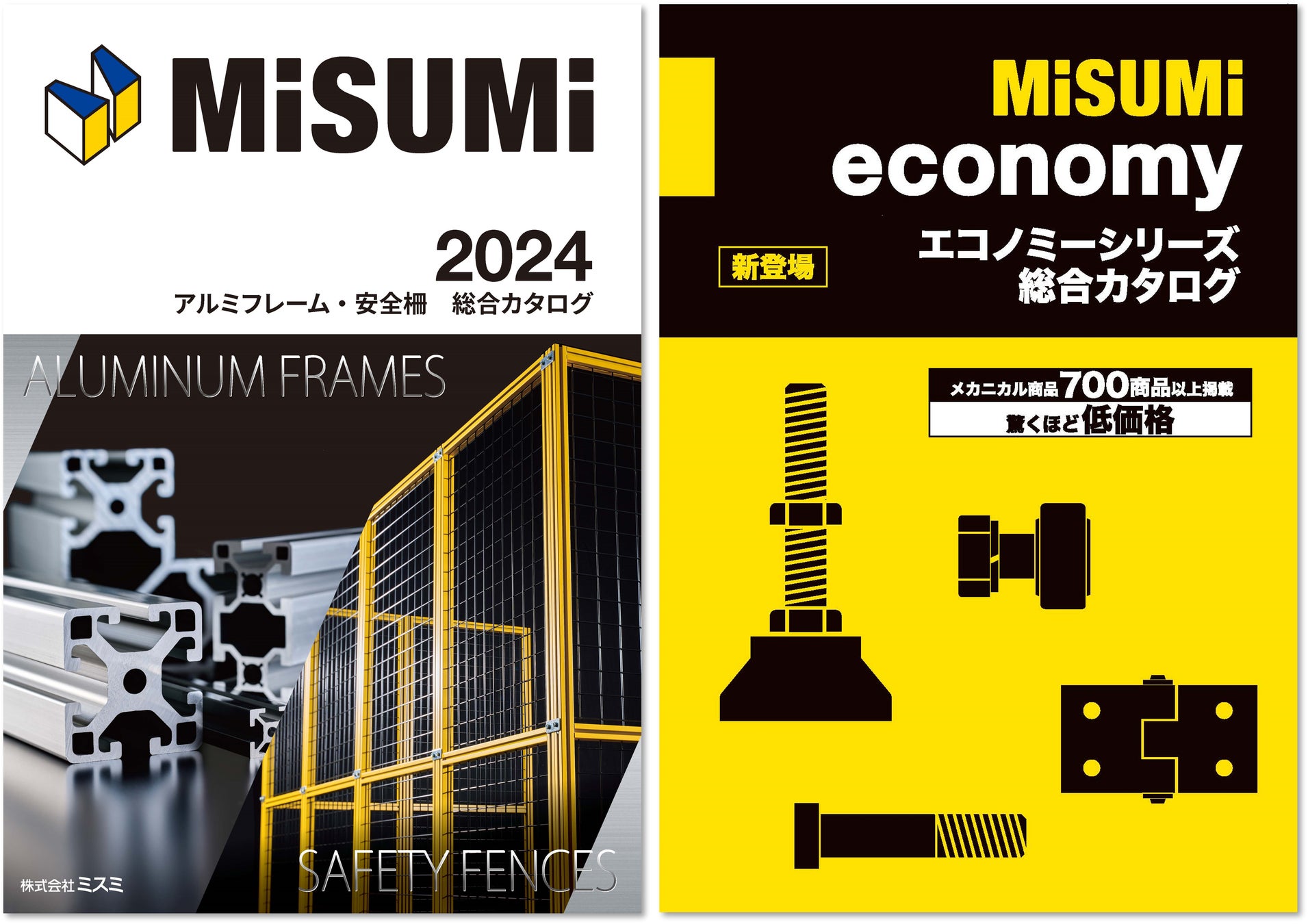 Both catalogs feature a wealth of new products and applications. One is dedicated to MISUMI’s “Economy Series” products, which offer an average price reduction of 45% *1. The other is dedicated to "aluminum frames" used as enclosures for automation equipment and "safety fences" used to prevent access to hazardous areas in factories. *1 Compared with our similar products