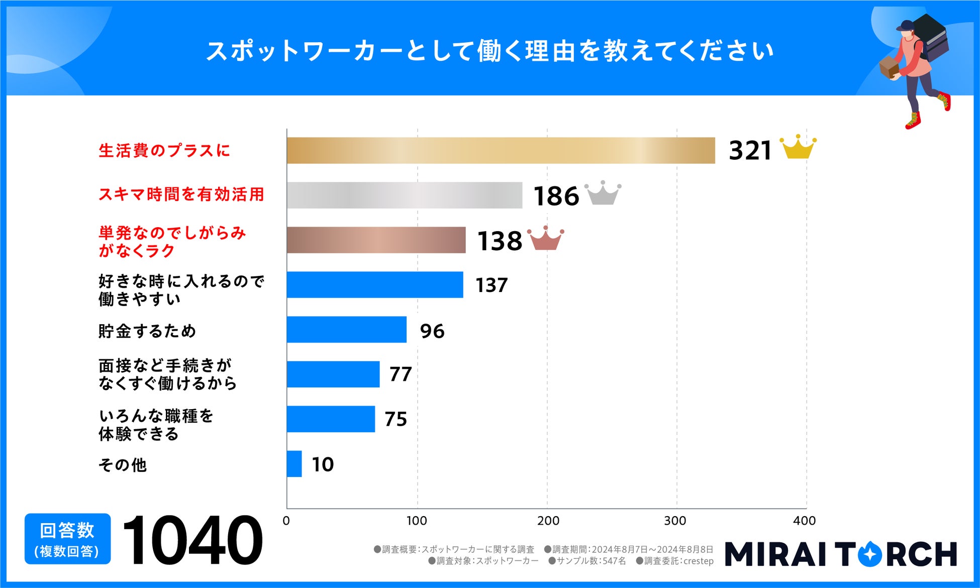 スポットワーカーとして働く理由について聞いたところ、「生活費のプラスに」と回答した人が321人と圧倒的に多いという結果でした。