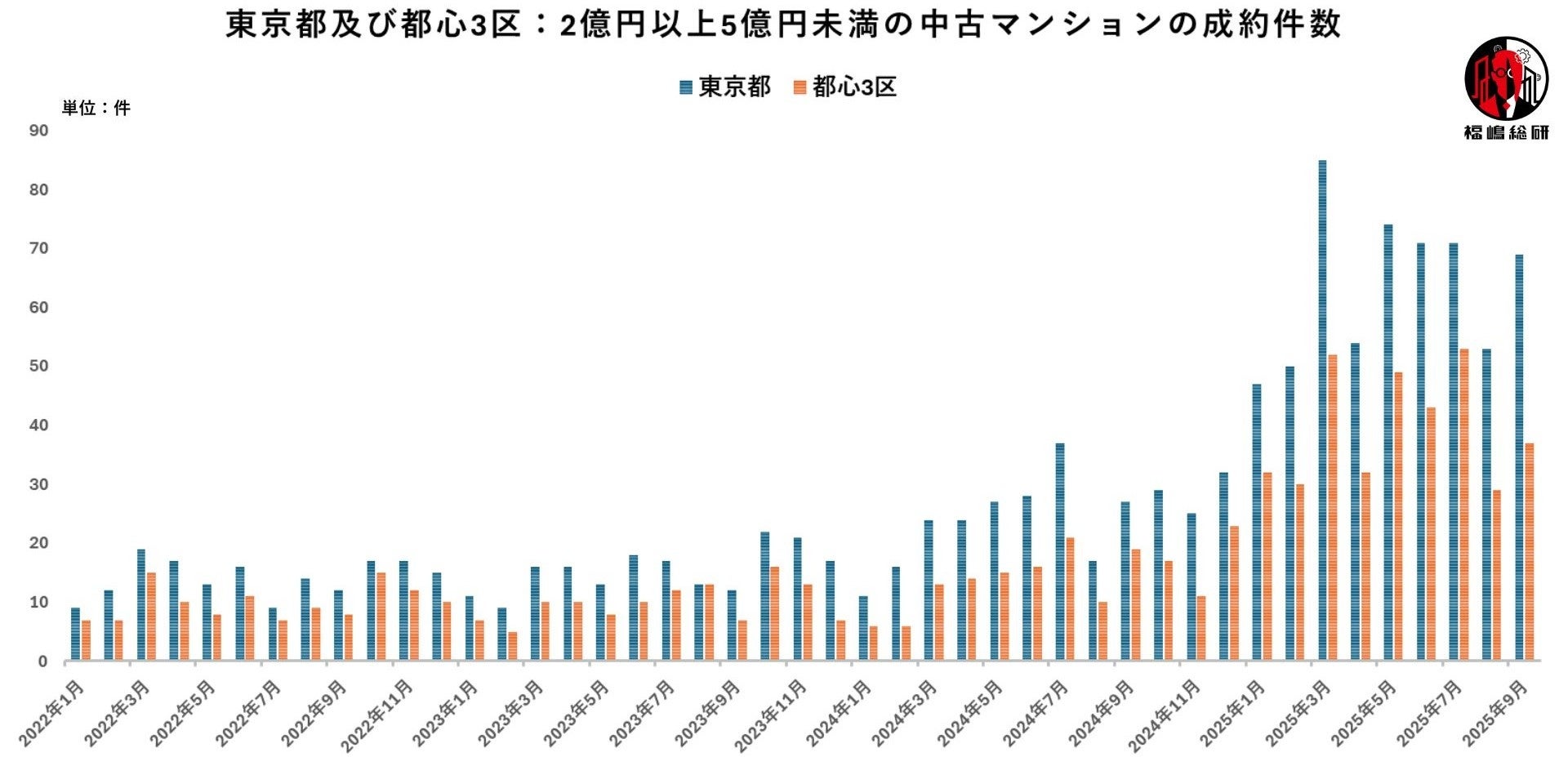 グラフ2:東京都及び都心3区:2億円以上5億円未満の中古マンションの成約件数