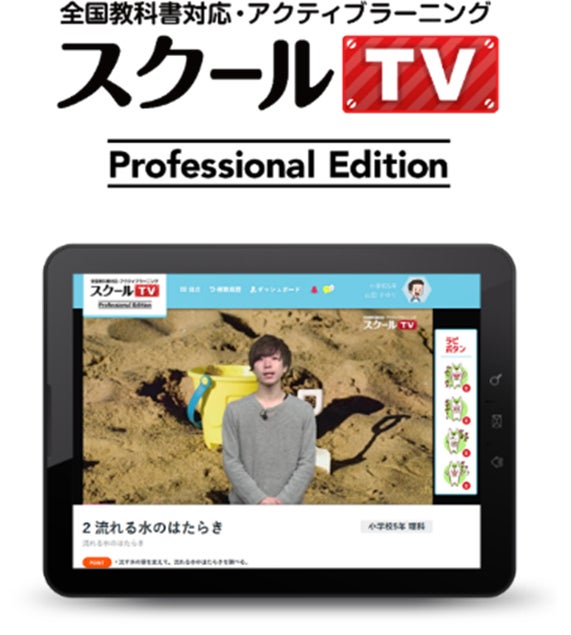 学習塾・学校などを対象とした「スクールTVプロフェッショナルエディション」は全国の主要科目の教科書内容を網羅した小中学生向けの動画教育サービスです。約1,000本の授業動画を配信し、自ら能動的に学習する「アクティブ・ラーニング」のメソッドを日本で初めて動画内に導入しています。授業動画を視聴中に、動画に連動した問題が出題されるインタラクティブなドリルを提供することにより、勉強が苦手な子どもたちでも飽きずに授業動画を視聴できるように設計されています。