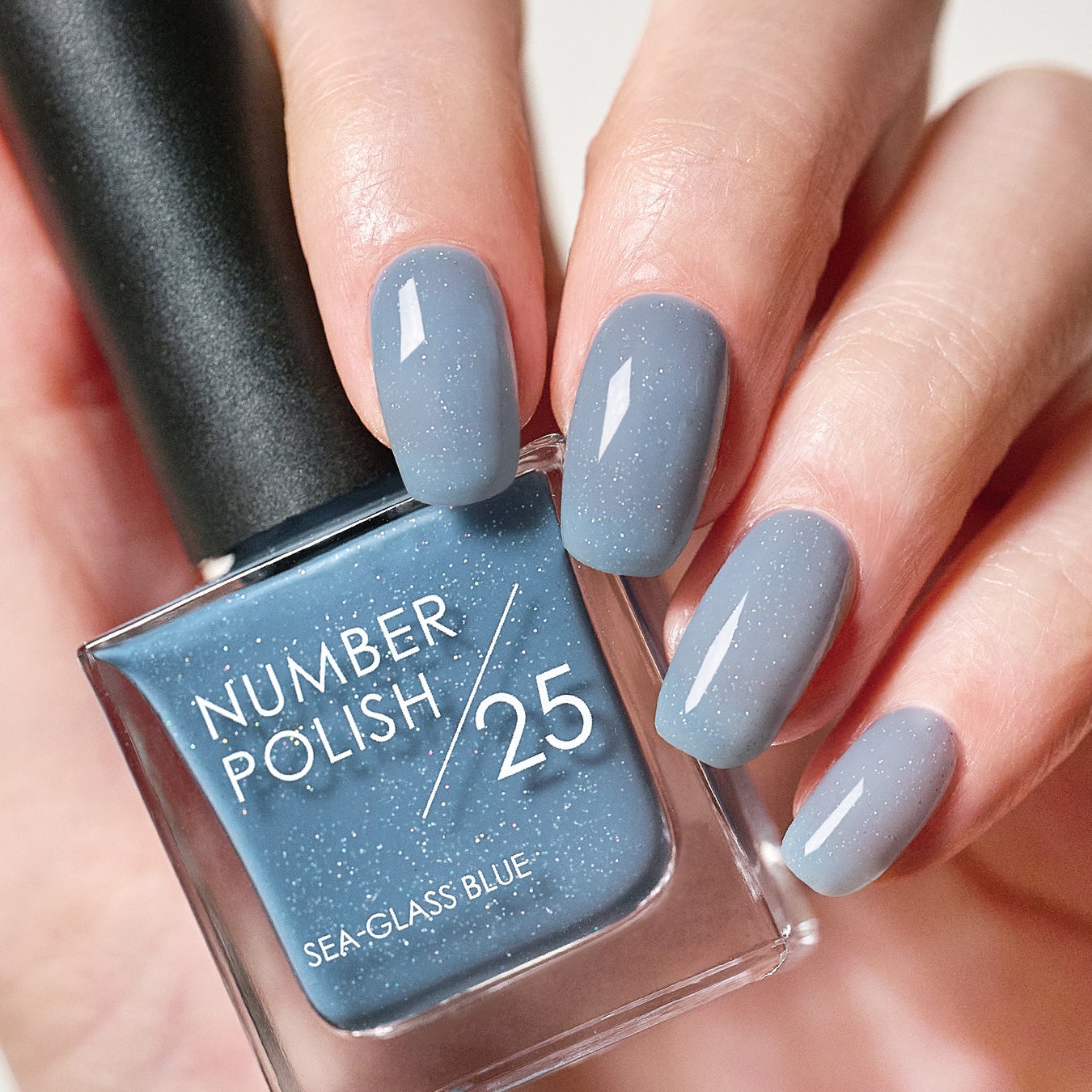 淡いブルーの中で波間に反射する日差しのような多色ラメがきらめく、海辺のシーグラスを彷彿させる薄青色。
