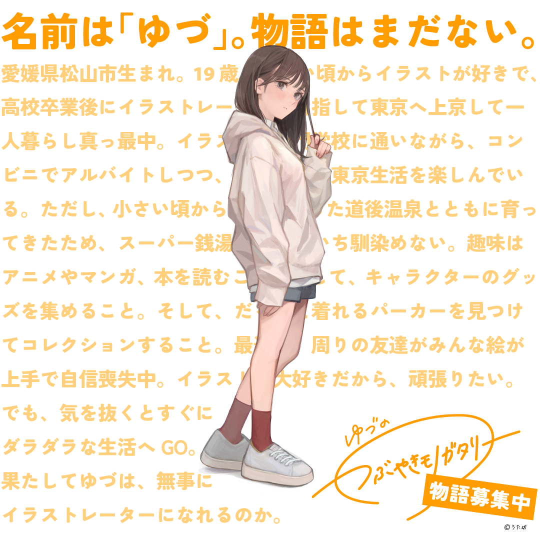 今回、イラスト・キャラクターデザインを担当するのは、人気イラストレーターの「うた坊」さん。チャーミングなキャラクターデザインに加え、バックグランドまで写し撮る細やかな背景描写は、多くのファンを生んでいます。うた坊さんご自身も「物語のあるイラスト」を大切にされているとのことで、今回の「つぶやきモノガタリー」で描かれる「ゆづ」は、キャラクターのみならず、背景で描かれるマンガや本、服などのアイテムに、ヒントが隠れているかも…?ぜひ、チェックしてみてくださいね!