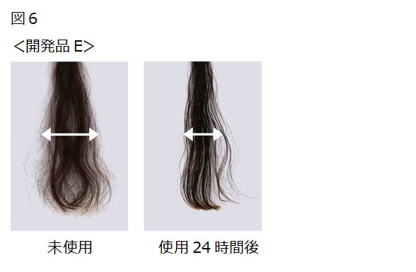 開発品 E を使用することにより毛髪の広がりを抑制し、24 時間持続することが新たな知見として得られました。