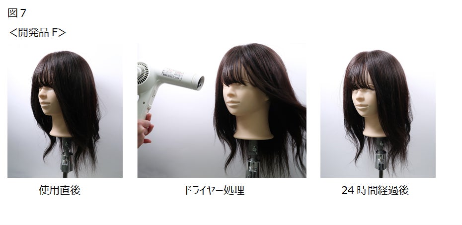 ウィッグの前髪にスプレータイプのセット樹脂配合型の開発品 F を用いてスタイリング処理を施した後、ドライヤーにより風を与え、スタイリング持続力があるかを評価しました。