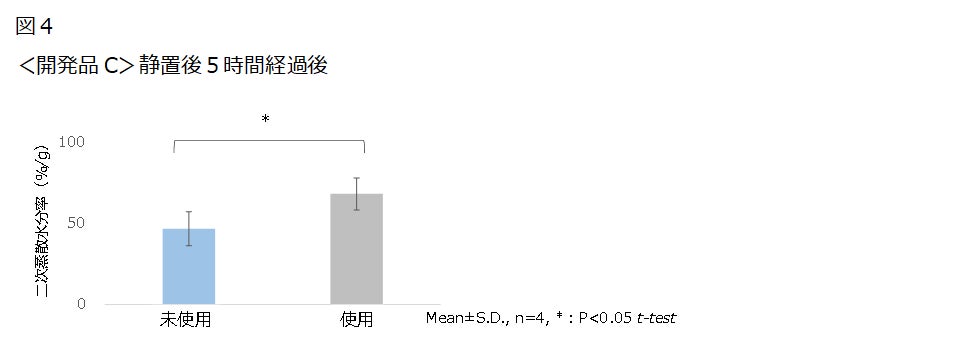 開発品 C を使用することで、室温静置5時間経過後でも未使用と比較して毛髪水分量が高いことが分かり、その