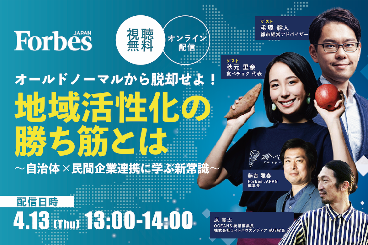 4月13日(木)13時よりForbes JAPAN公式YouTubeにて配信。オールドノーマルから脱却せよ!地域活性化の勝ち筋とは〜自治体×民間企業連携に学ぶ新常識〜