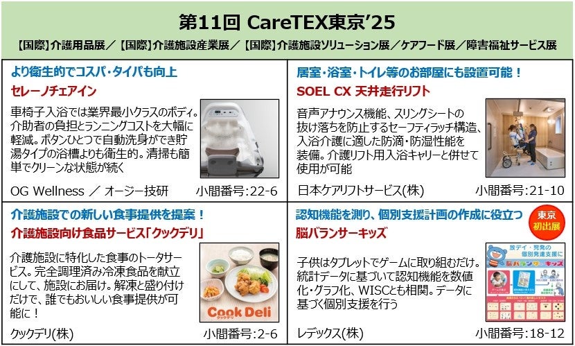 急激なスピードで高齢化が進む中、介護施設も増え続け介護用品のニーズは急速に拡大している。本展には最新の介護用品・設備をはじめ、介護食・配食サービス、障害福祉事業所向けの商品・サービスが集結し、多数の介護・福祉施設が商品選定や商談を目的に来場する。