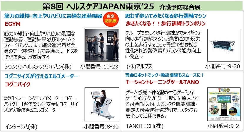 世界に先駆けて超高齢社会を迎えるわが国では、介護予防・健康⻑寿を促進する商品やサービスへのニーズが急激に高まっている。この大きな需要の高まりを受け、本展では、トレーニングマシンや認知症予防用品などの商品・サービスなどが幅広く出展する。