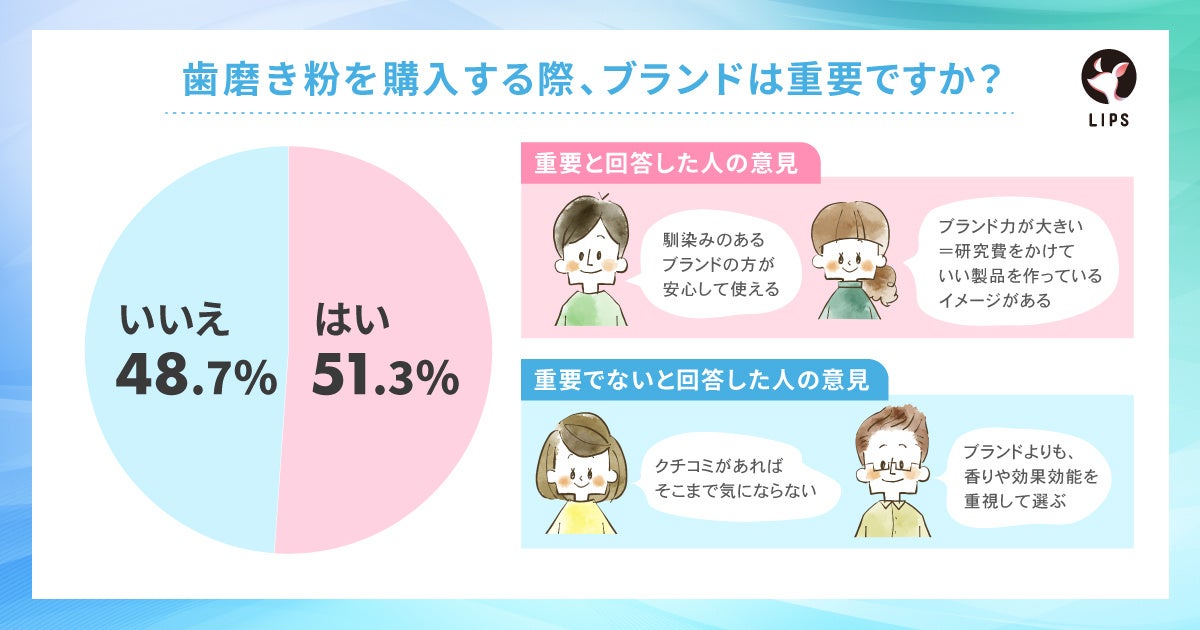 歯磨き粉を購入する際に「ブランドが重要」と答えた人の割合が51.3%、「重要でない」と答えた人の割合が48.7%と、ほぼ同じ割合で意見が分かれていることが分かります。