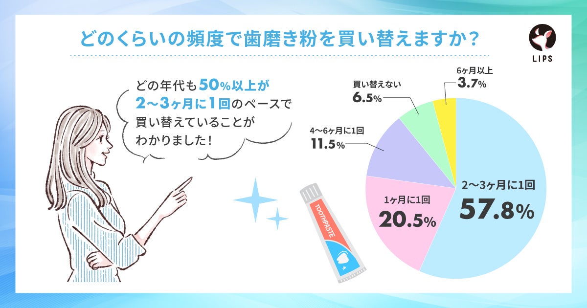 アンケート結果から、歯磨き粉を買い替える頻度として「2~3ヶ月に1回」が最も多く選ばれており、その割合は57.8%に達しています。また、1ヶ月に1回買い替えるユーザーも20.5%存在し、頻繁に歯磨き粉を変更する層が多数を占めることがわかります。