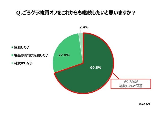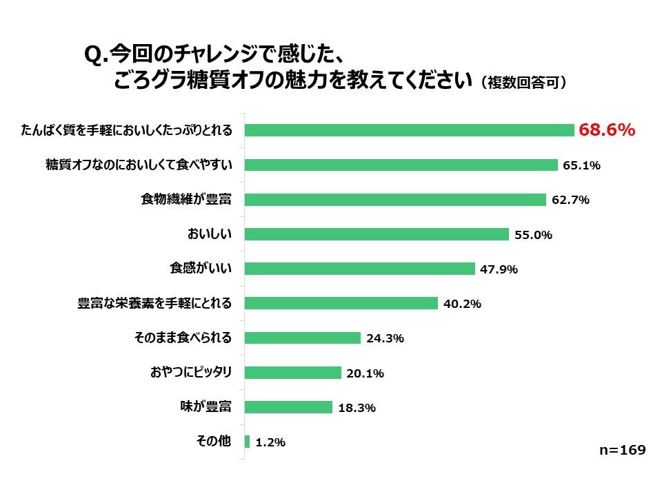 調査方法:【“ごろグラ糖質オフ”7 日間チャレンジ!】として、日清シスコの「ごろグラ糖質オフ」シリーズの任意のフレーバーを購入したカロミルユーザーの中から、合計 7 日間以上喫食登録をした169 人に対し、WEB 上で アンケートを実施