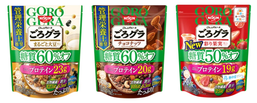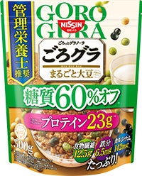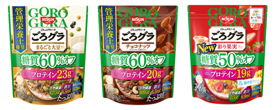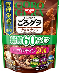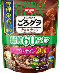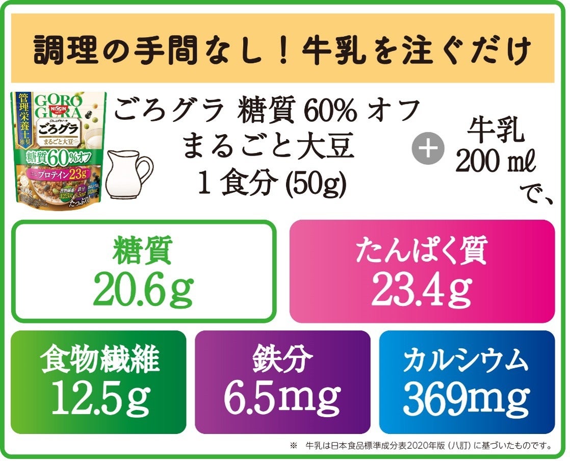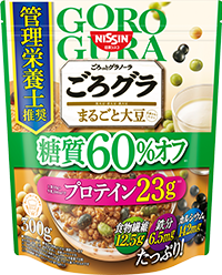 レギュラー品(「ごろグラ まるごと大豆」「ごろグラ チョコナッツ」「ごろグラ 彩り果実」とそれぞれ同重量で比較)と比べて、まるごと大豆、チョコナッツは、糖質を 60%オフ、 彩り果実は 50%オフ。調理の手間なしで牛乳や豆乳、お好みの植物性ミルクを注ぐだけで忙しい朝にも手軽に用意可能。