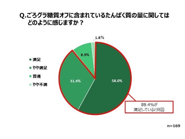 89%が「ごろグラ糖質オフ」に含まれているたんぱく質の量に「満足」「やや満足」と回答!