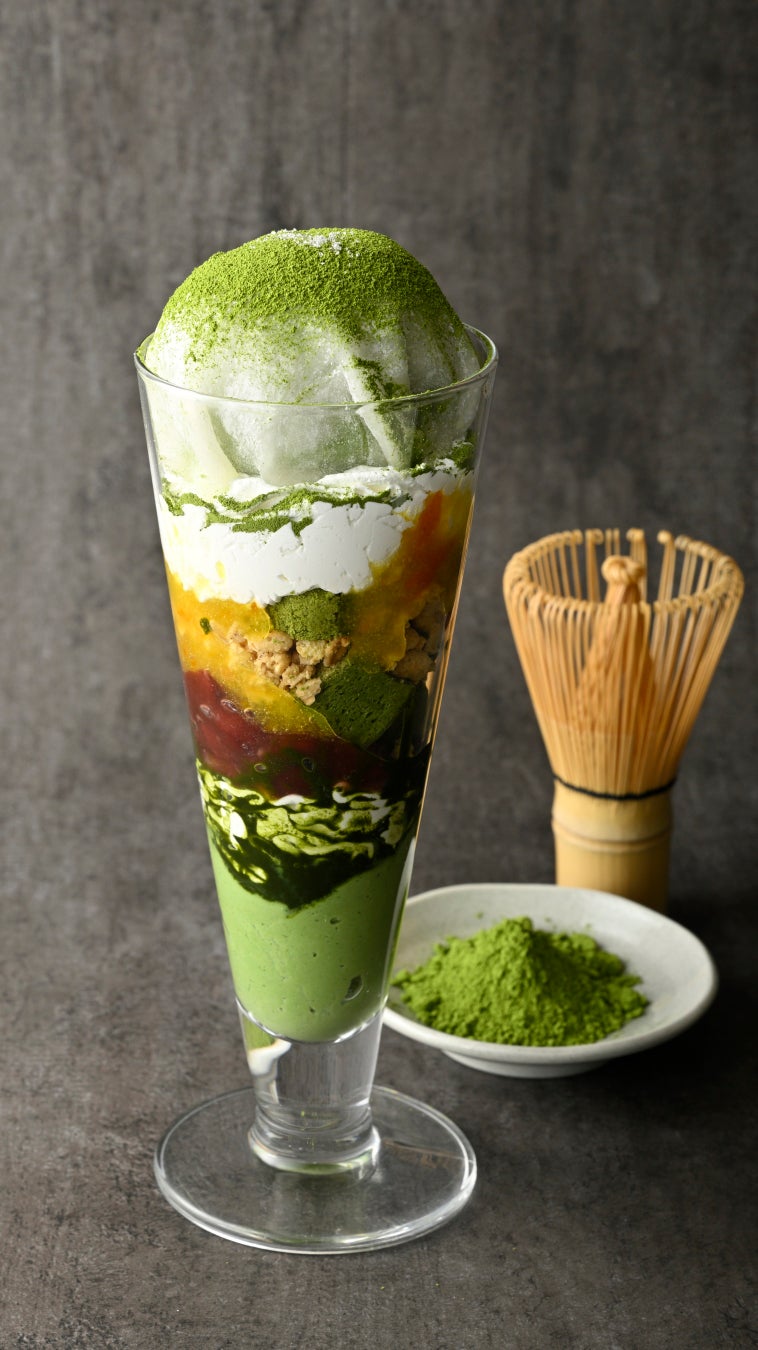 抹茶プリン、オリジナル宇治抹茶ソース、抹茶のパンケーキ、と色々な形で抹茶を楽しめる抹茶づくしのパフェ。