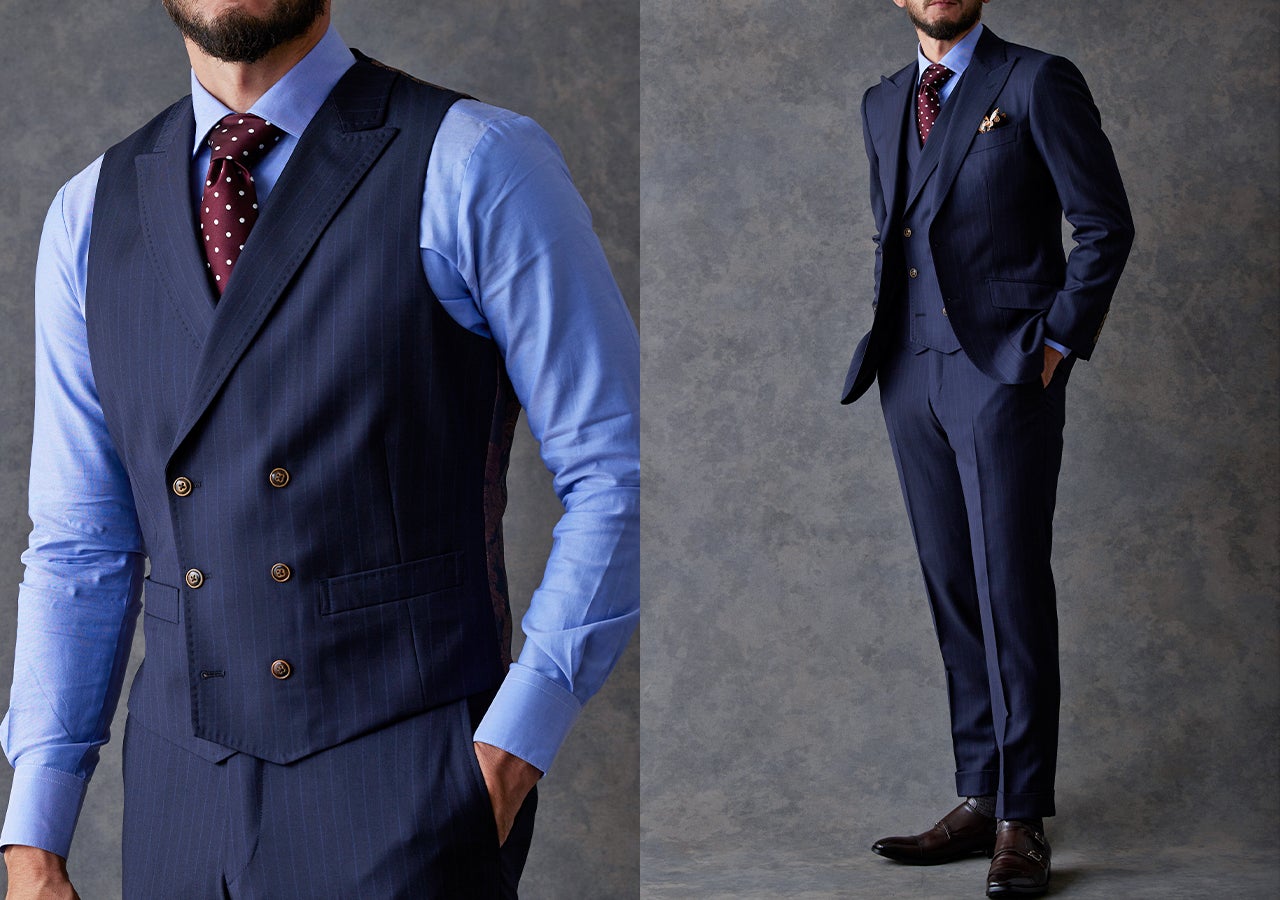 襟付きダブルベストは4種類あるス-ピースの中で最も重厚感のある正統派クラシックスタイルになります。