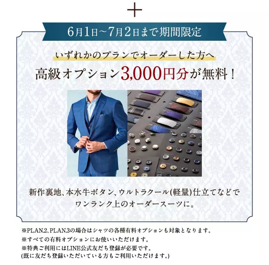 オーダースーツ専門店「グローバルスタイル」に上質なスリーピーススーツが1着あたり3万円台から仕立てられる新プラン登場!さらに新プランご利用の方に3,000円分の高級オプションプレゼント。