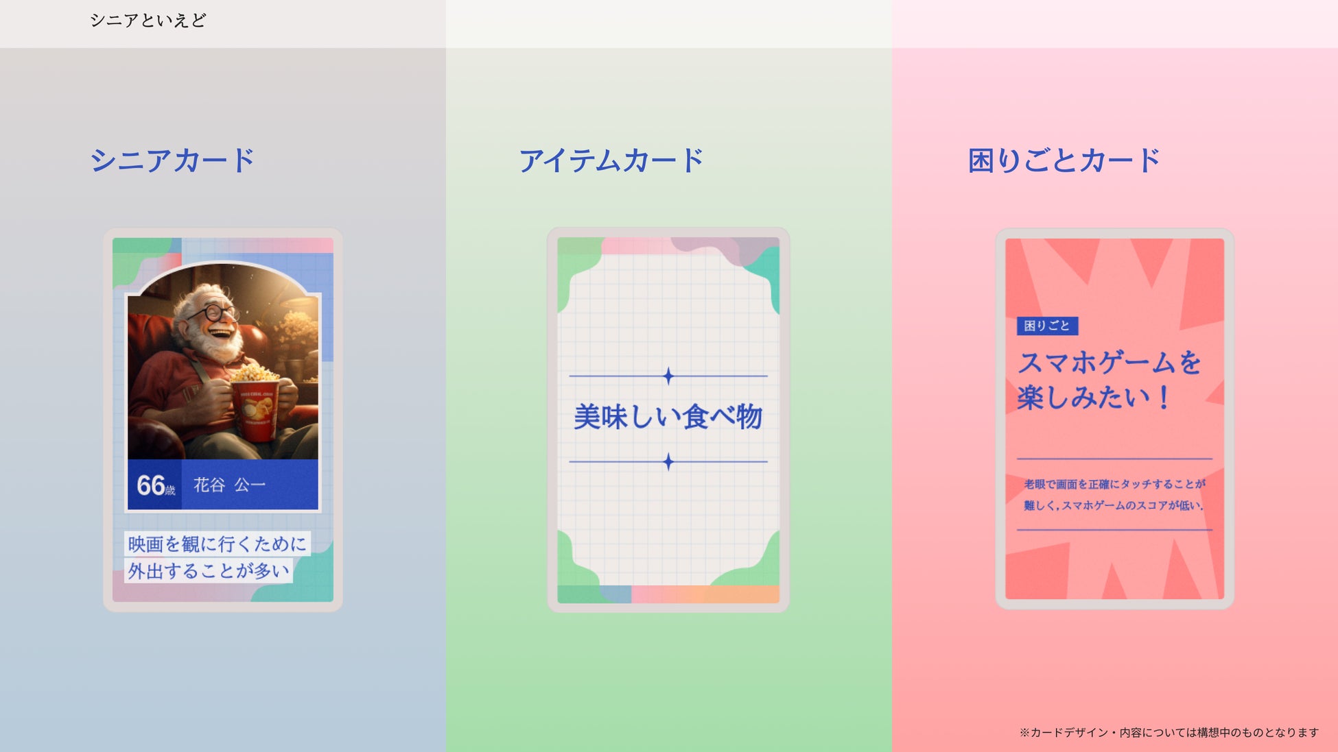近年、シニア・高齢者に関する話題として「高齢者ドライバー」「年金の受給」「老老介護」などを多く目にします。高齢者=ネガティブという固定概念が広がっているのではないかという仮説のもと、これから包摂(インクルード)するべきシニア・高齢者ユーザーをまとめたカードを新たに開発しました。