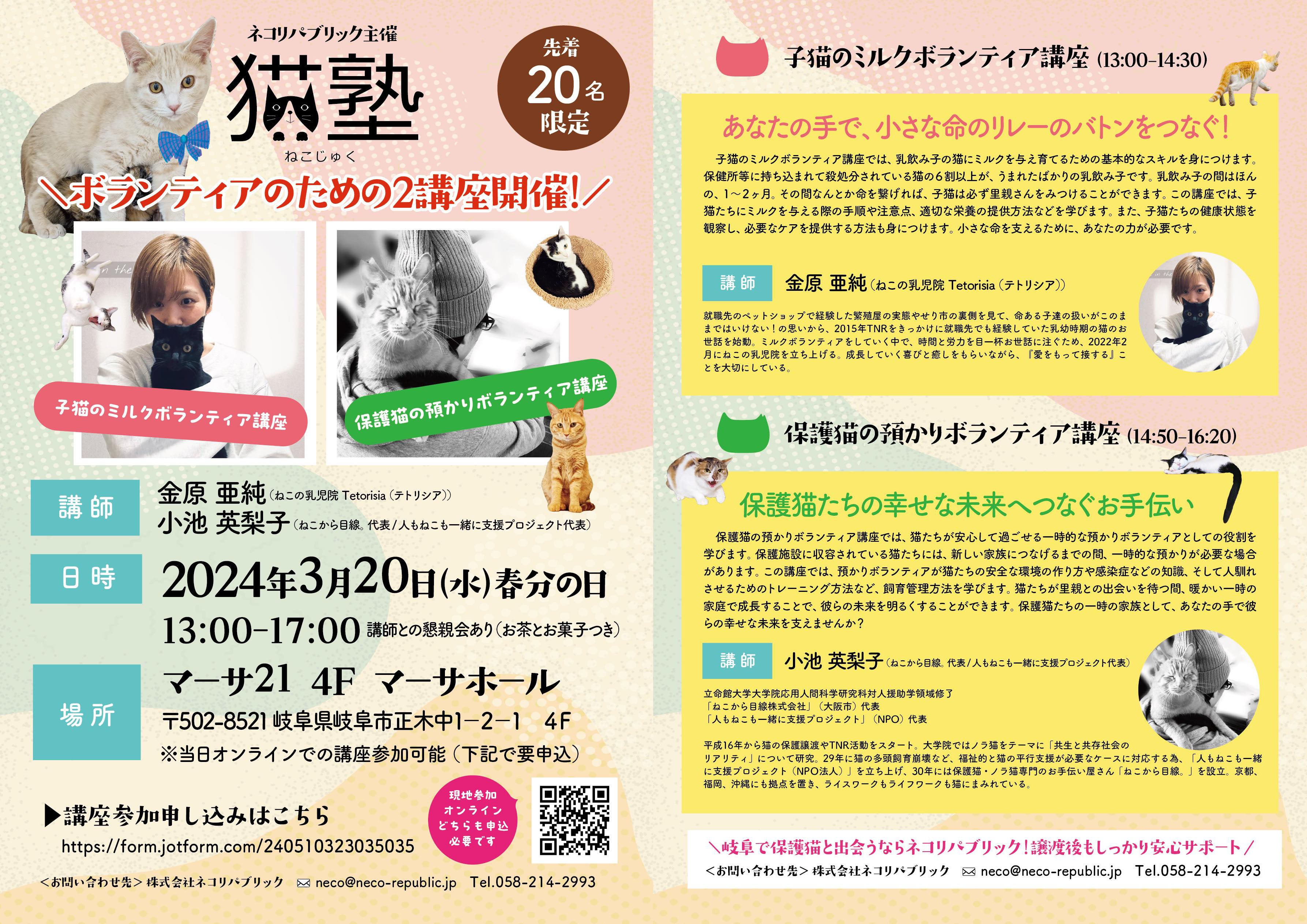株式会社ネコリパブリック(本社所在地:東京都台東区蔵前、代表取締役:河瀬麻花)は、ねこの乳児院 Tetorisia(代表:金原亜純)と、ねこから目線。(代表:小池英梨子)と共に、マーサ21(所在地:岐阜県岐阜市正木中1-2-1)にて、「子猫のミルクボランティア講座」「保護猫の預かりボランティア講座」を受講できる「猫塾」を開催します。(お申込みフォーム:https://form.jotform.com/240510323035035)