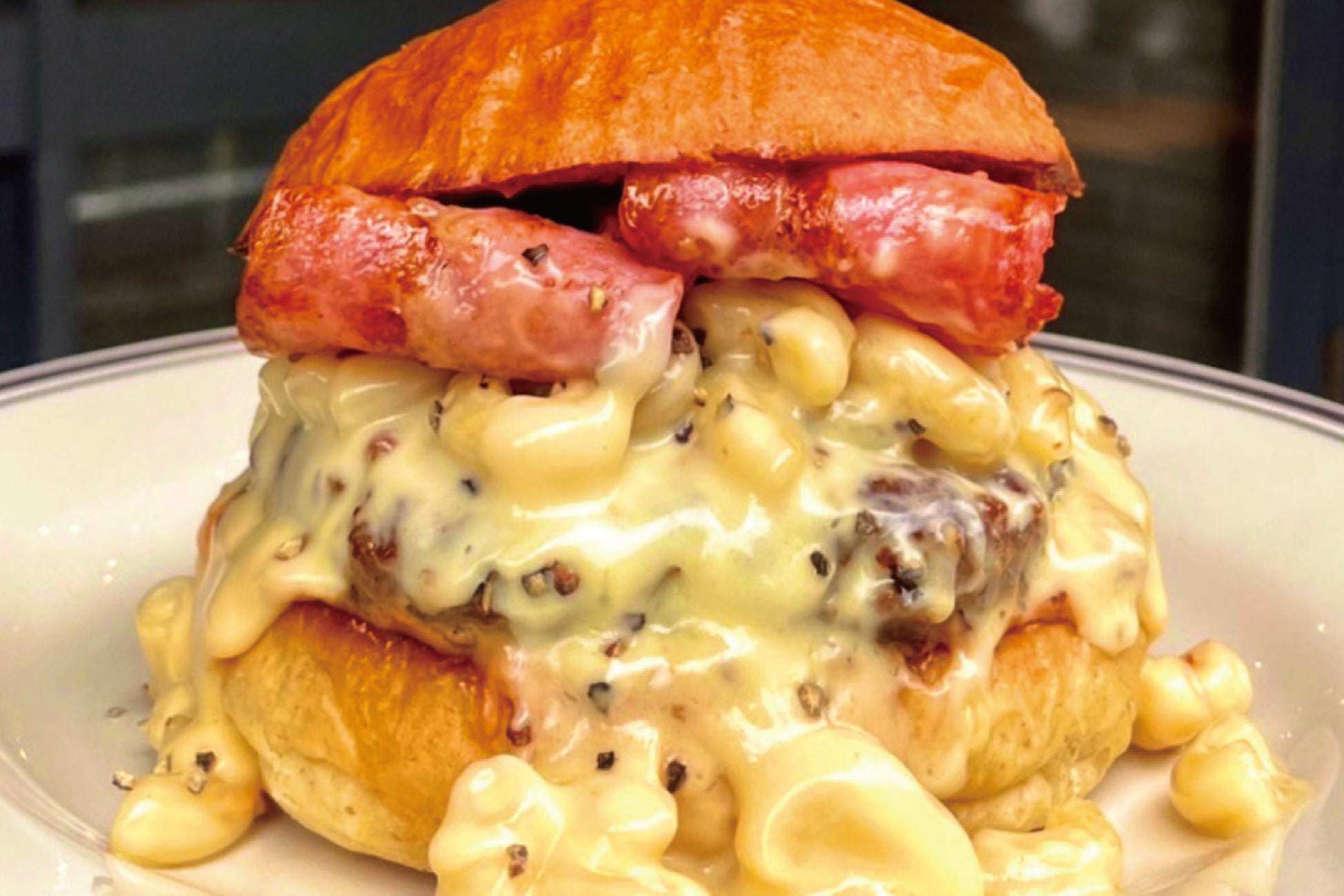アメリカの定番家庭料理「マカロニチーズ」をたっぷり挟んだ、肌寒い季節にぴったりの『マッケンチーズバーガー』。全てオリジナルレシピの当店のハンバーガーをぜひご賞味下さい!