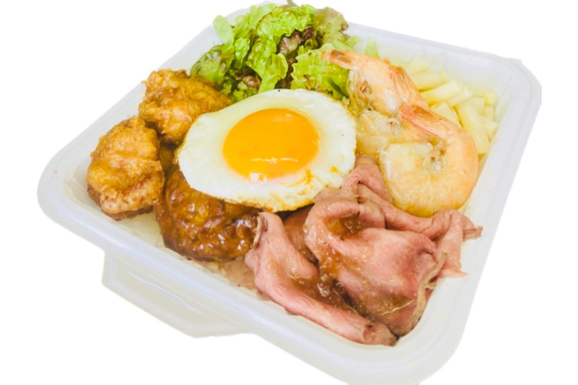 モチコチキン、ガーリックシュリンプ、ロコモコ、ステーキをお好きな組み合わせでランチBOXとしてお楽しみください。