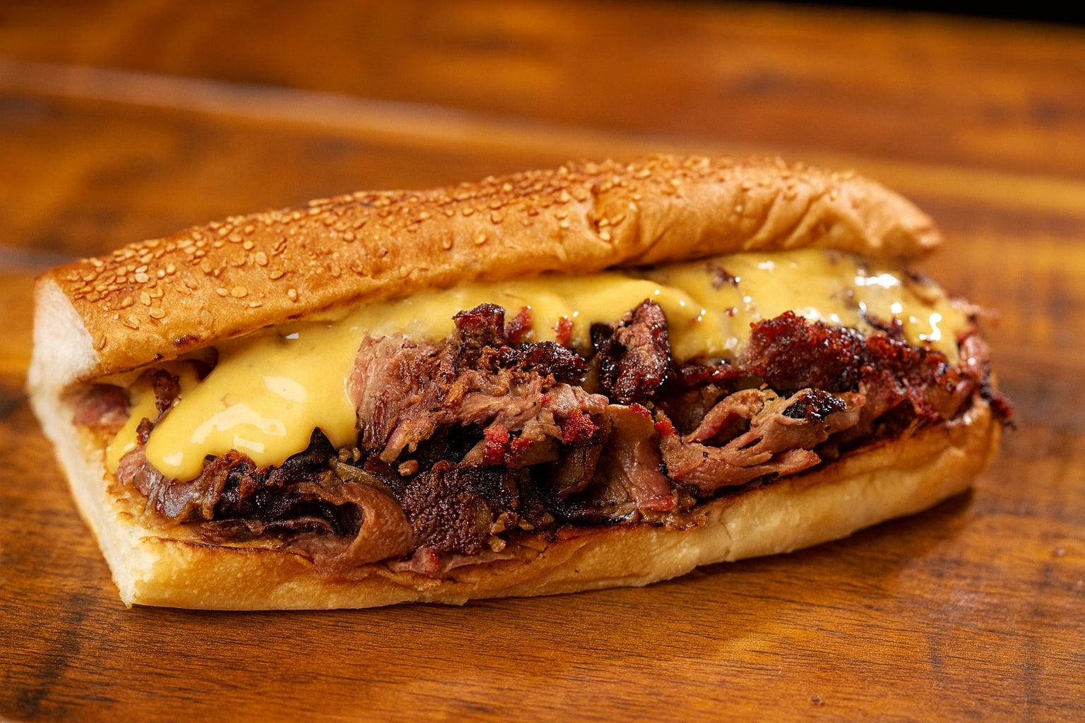 フィラデルフィア名物、アメリカ産アンガス牛のジューシーな牛バラ肉に濃厚チーズを挟んだ贅沢サンドです。