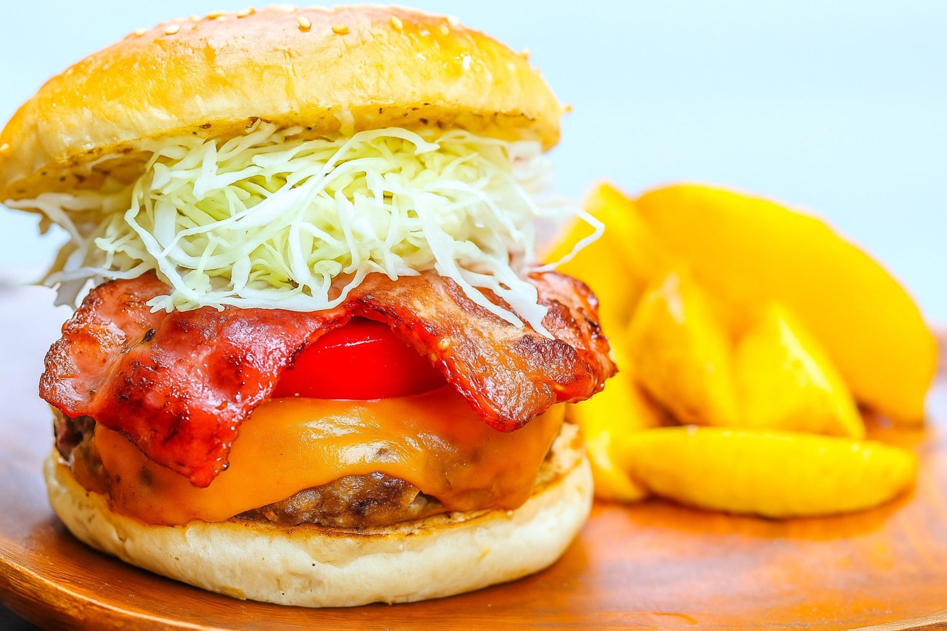 淡路牛100%の旨みを堪能!とろけるチーズと香ばしいベーコンが彩る、1日50食限定の贅沢な「アメリカン淡路牛バーガー」をぜひご賞味ください。