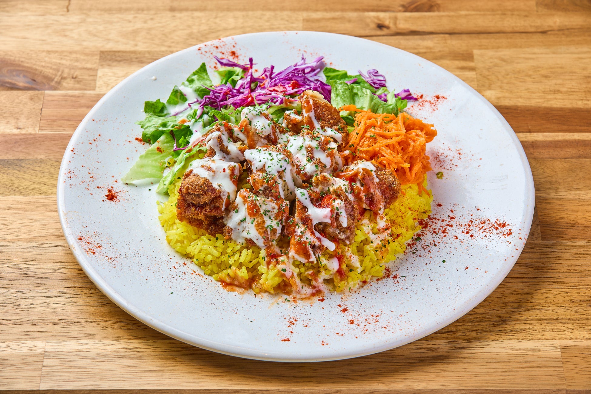 数種類のスパイスで漬け込んだチキンをサクサク食感のフライドチキンに仕立て、ターメリックライスの上に自家製ソースをたっぷりかけた当店人気NO.1メニューです。