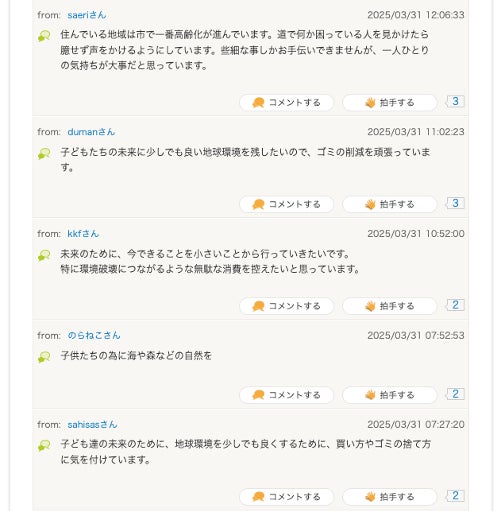 『みんなのサステナ&エシカルAction!』は、2024年10月28日(月)から2025年3月31日(月)までの約5ヶ月間にわたり開催され、延べ1,229名のユーザーが参加、総コメント数は5,477件にのぼりました。寄せられたコメントからは、本イベントが、参加したユーザーがサステナブルについて「自分ごと」として考える機会となった様子が伺えました。