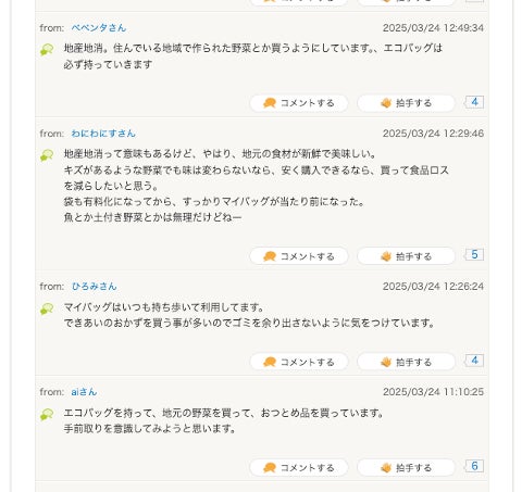 特に注目を集めた「企業のサステナ&エシカル」トピックでは、企業の取り組みに対して、環境・伝統・技術・暮らしといった多様な観点からの共感が集まり、「応援したい」「もっと知りたい」といった声が目立ち、企業への信頼感や期待が可視化されました。また、「いつもの買い物を変える」という身近なテーマでは、てまえどりの実践や地産地消への意識など、すぐに行動に移せる実践例が続々と紹介されました。