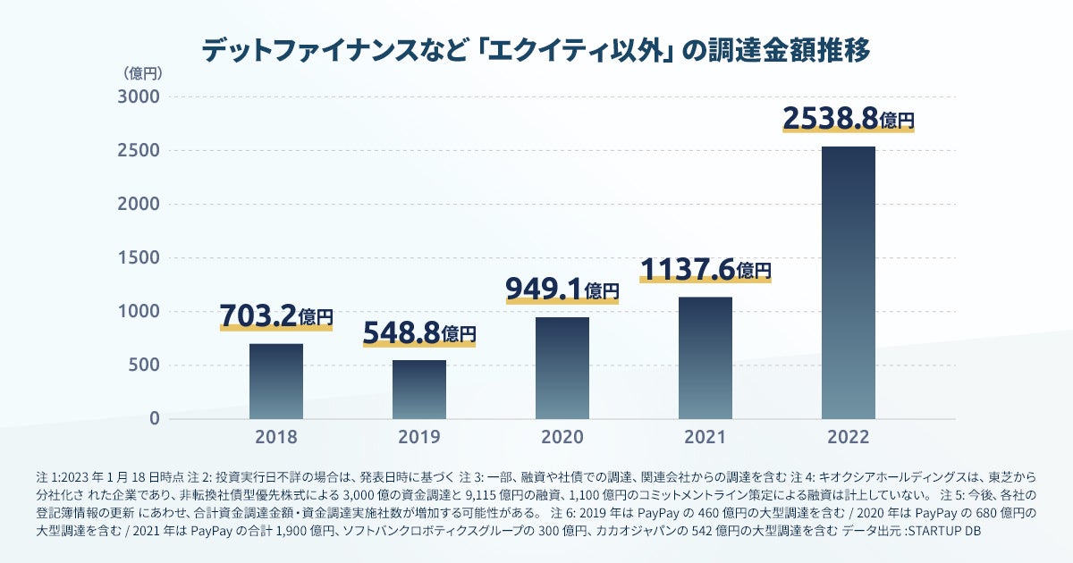 2022年には、日本でも100億円規模のデットでの調達を発表するIPO前後の企業が複数現れ、11月に政府が公表した「スタートアップ育成5か年計画」( https://www.cas.go.jp/jp/seisaku/atarashii_sihonsyugi/pdf/sdfyplan2022.pdf )では、銀行等によるスタートアップへの融資促進に言及されるなど、デットでの資金調達/資金供給への注目度は高まっています。