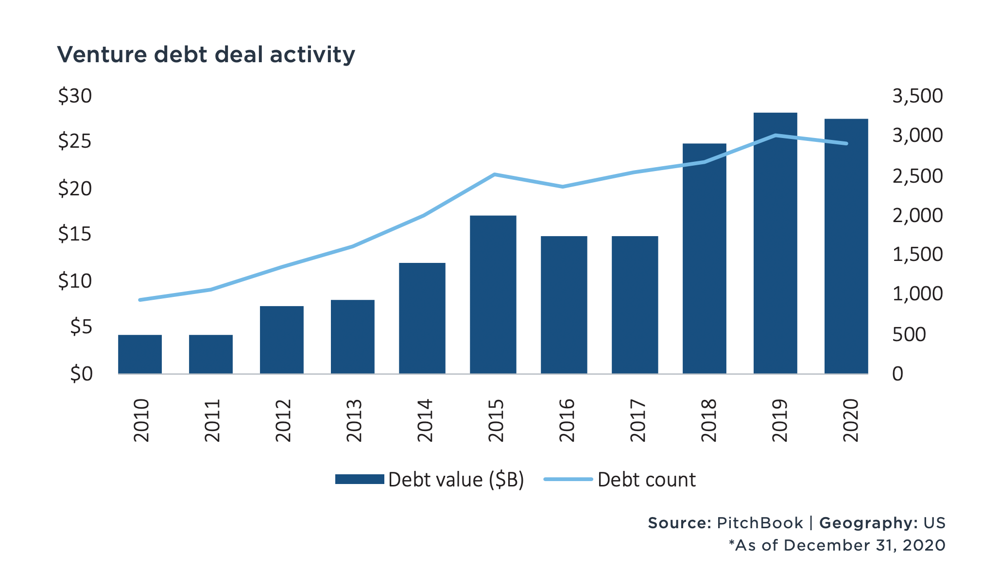 既に米国ではIPO前後の企業によるデット調達が選択肢の一つとして浸透しており、多くの企業で活用されています。以下の図からも見て取れるとおり、2010年からの10年間で比較すると6倍以上の調達規模に拡大しています。